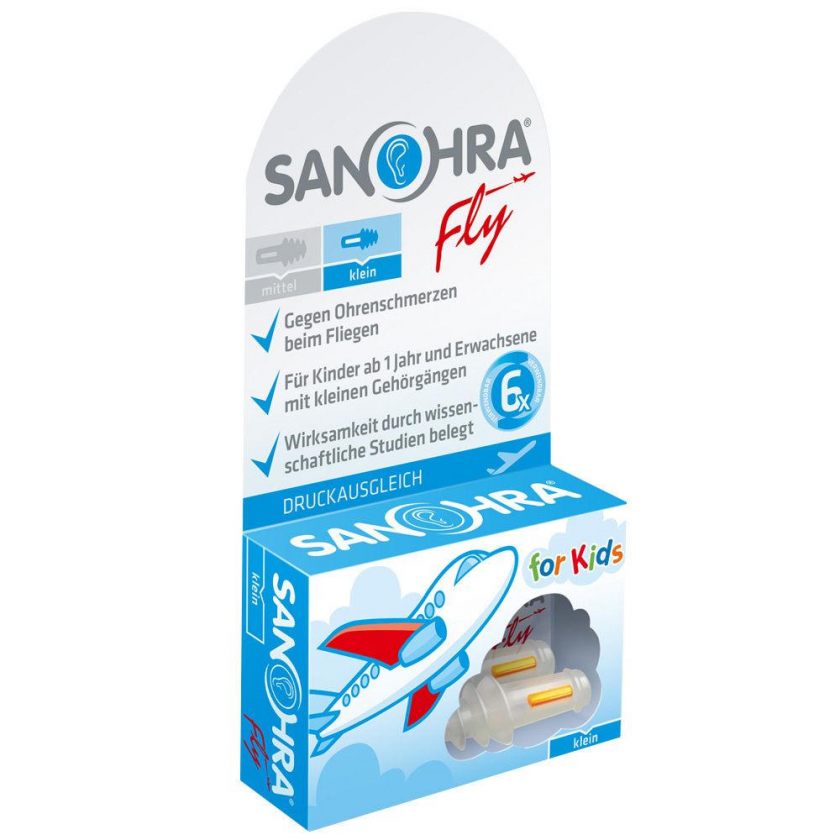 Sanohra® Fly для детей - специальные ушные вкладыши для защиты от перепадов давления при авиаперелетах. Предназначены для детей от 1 года и взрослых с узкими слуховыми проходами. Предотвращают боль в ушах во время взлета и посадки самолета, создавая буферную камеру с высокоточным фильтром для замедления изменения давления.