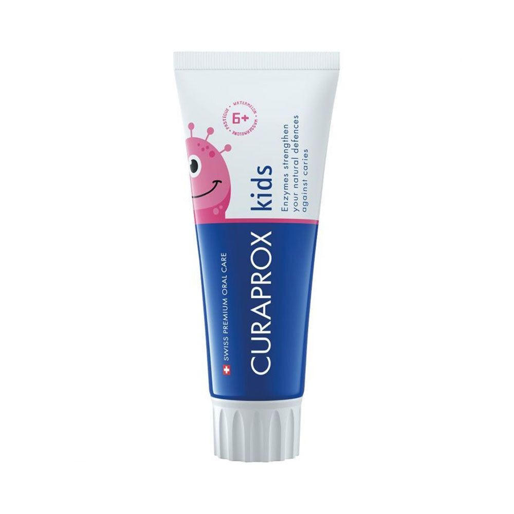 Детская зубная паста CURAPROX kids с ароматом арбуза для защиты зубов детей от 6 лет. Содержит 1450 ppm фторида для реминерализации эмали, ферменты для поддержки естественной защиты слюны и ксилит для нейтрализации кислот. Без SLS, микропластика и триклозана.