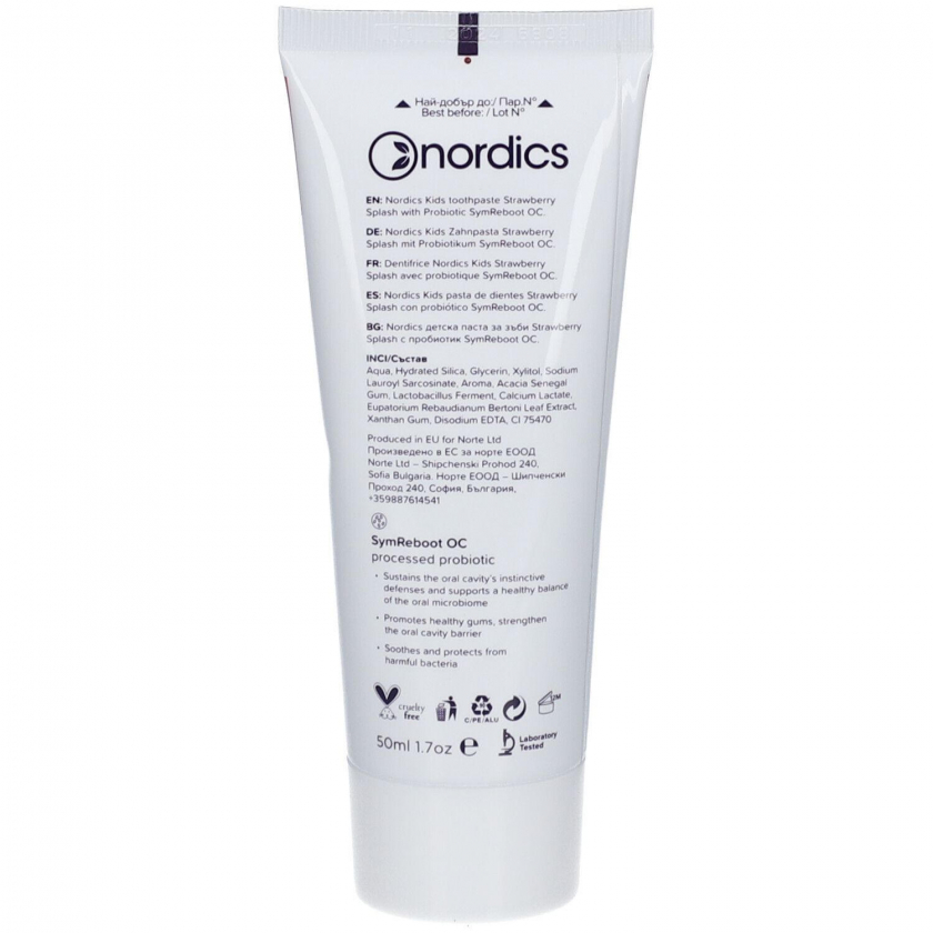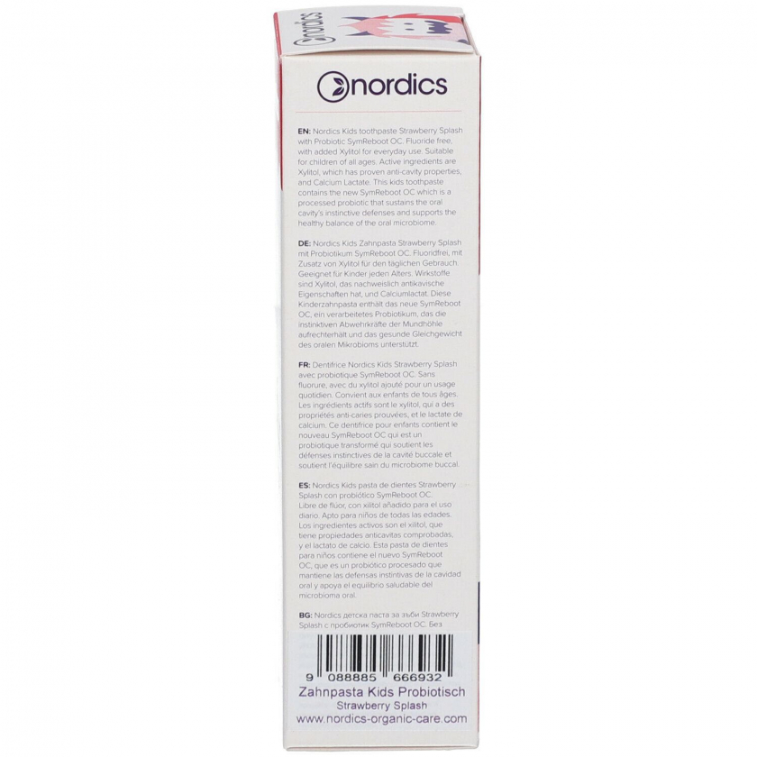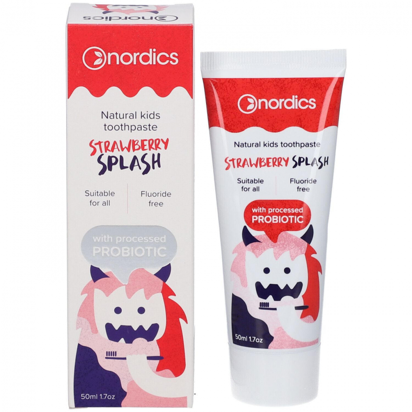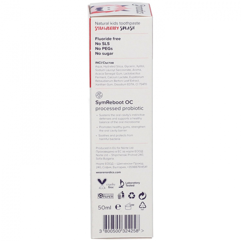 Детская зубная паста nordics STRAWBERRY SPLASH с клубничным вкусом, без фтора, с ксилитом и пробиотиком SymReboot OC для защиты от кариеса и поддержания здоровой микрофлоры полости рта. Подходит для детей всех возрастов, специально разработана для чувствительных зубов и десен.