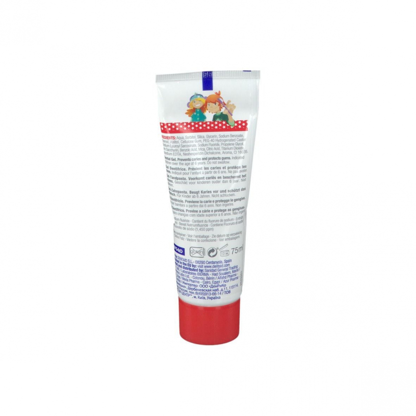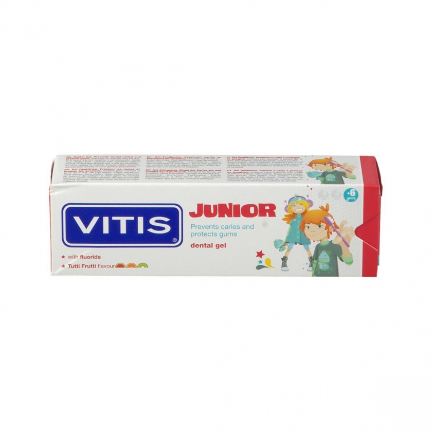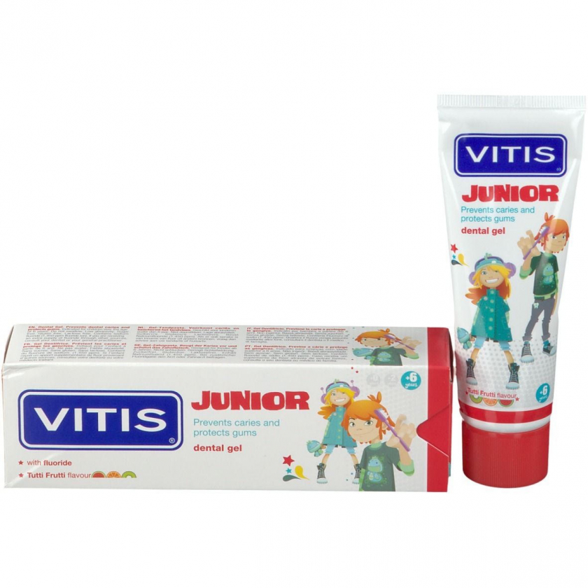 Детский зубной гель VITIS Junior для детей старше 6 лет с фторидом, пантенолом и ксилитом. Защищает от кариеса, укрепляет эмаль, ухаживает за деснами при прорезывании постоянных зубов. Имеет фруктовый вкус и низкую абразивность.
