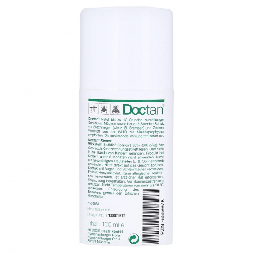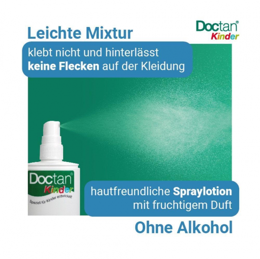 Doctan® Für Kinder - инсектицидный спрей-лосьон для защиты детей от насекомых с 6 месяцев. Содержит рекомендованный ВОЗ икаридин, обеспечивает до 12 часов защиты от комаров и до 8 часов от клещей. Имеет легкий оливковый аромат, не липкий, приятный для кожи.