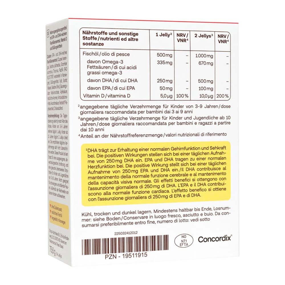 Концентрат рыбьего жира, богатый EPA и DHA (Clupea harengus, Sardina pilchardus, Scomber scombrus, Thunnus), подсластители: ксилит, сорбит; вода, желатин (говяжий), регулятор кислотности: цитрат натрия, яблочная кислота; натуральные ароматизаторы; антиоксидант: аскорбиновая кислота, краситель: экстракт паприки, холекальциферол (витамин D)