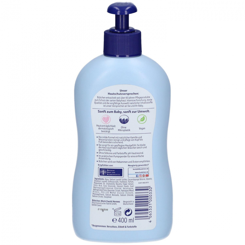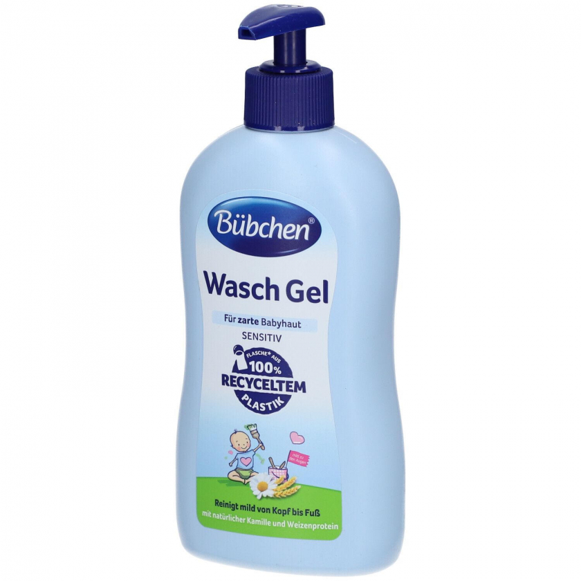Мягкое гель для мытья Bübchen с экстрактом ромашки и пшеничным белком для ежедневного ухода за нежной детской кожей. Защищает кожу, поддерживает естественный барьер, pH-нейтральное, без аллергенных отдушек, рекомендовано дерматологами, акушерами и врачами.