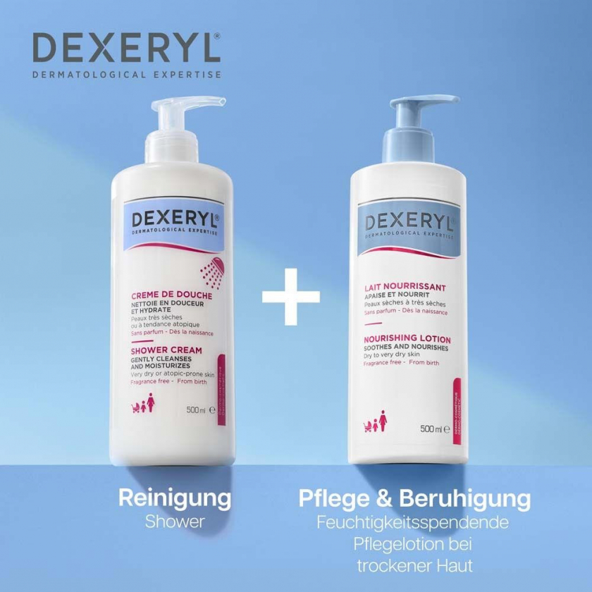 DEXERYL® Duschcreme - гипоаллергенная душевая крем-пенка для мягкого очищения и интенсивного увлажнения очень сухой кожи, склонной к нейродермиту. Подходит для всей семьи, включая младенцев и детей. Без парфюма и мыла, дерматологически протестирована
