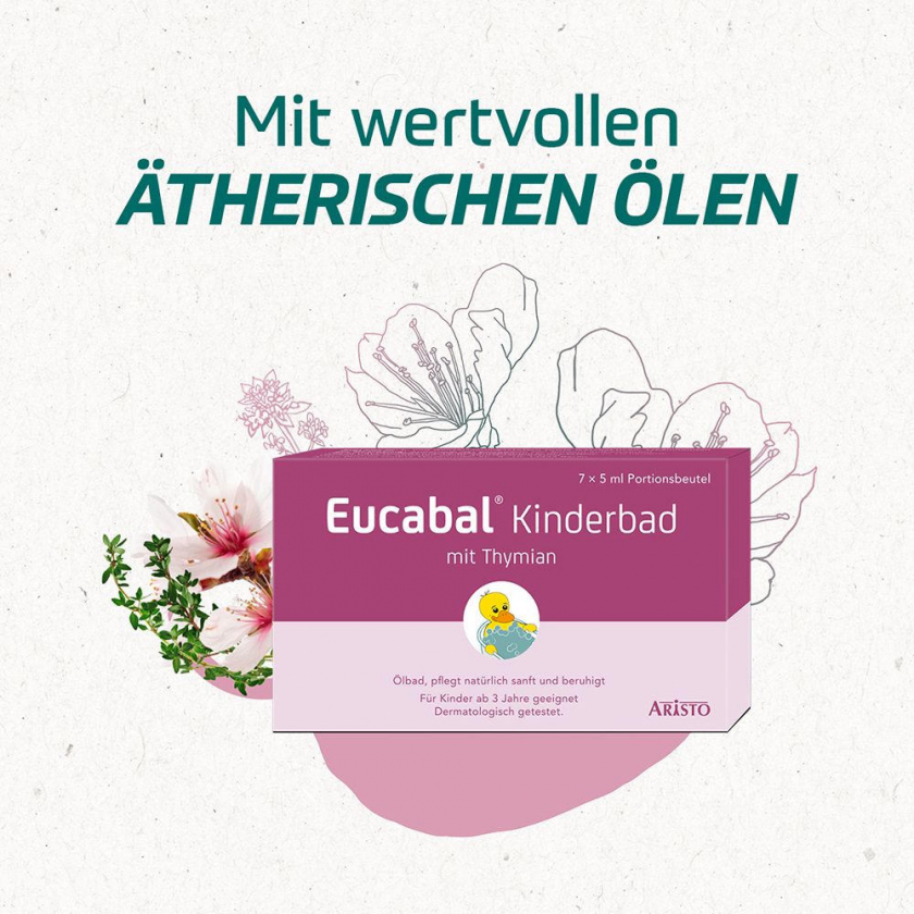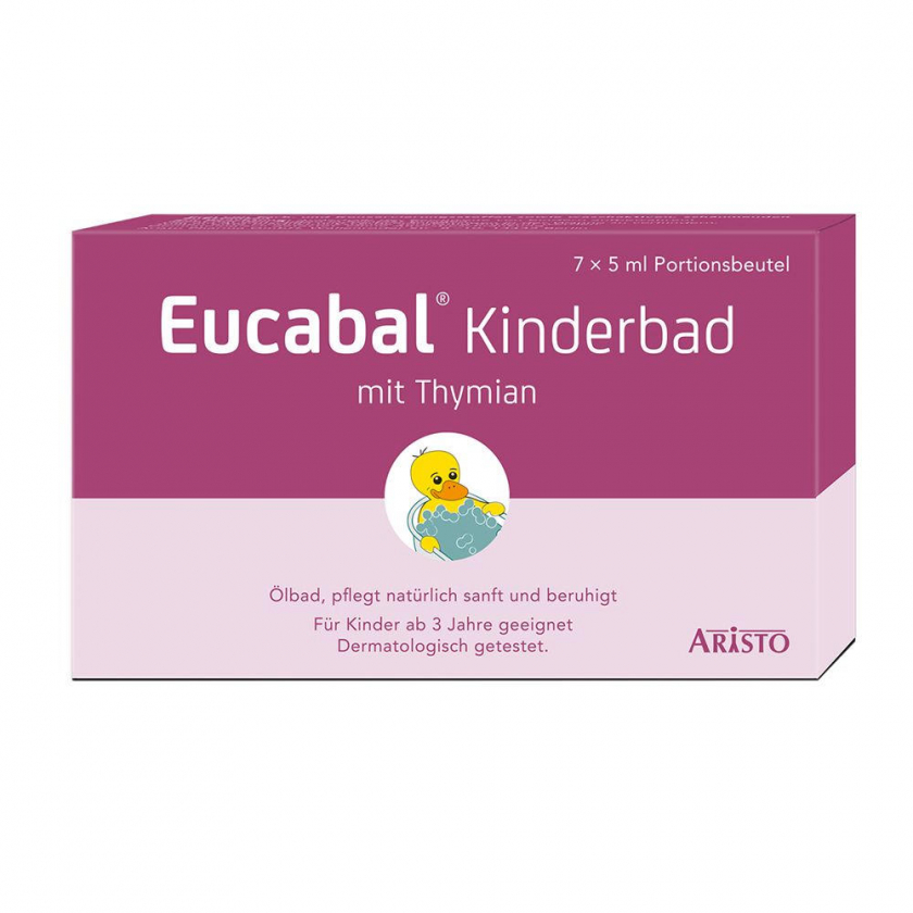 Eucabal Kinderbad mit Thymian - детский бальзам для ванны с тимьяном, успокаивающий дыхательные пути и ухаживающий за чувствительной детской кожей. Подходит для детей с рождения (после полного заживления пупка), не содержит пенообразующих веществ, красителей, отдушек и консервантов. Произведено в Германии, дерматологически протестировано.