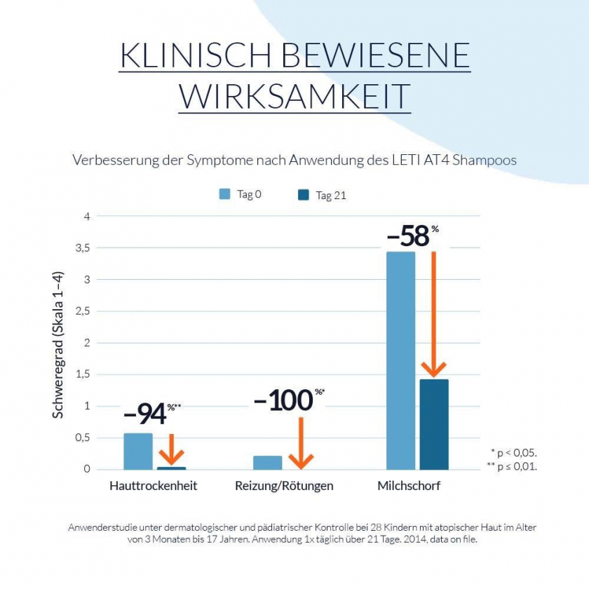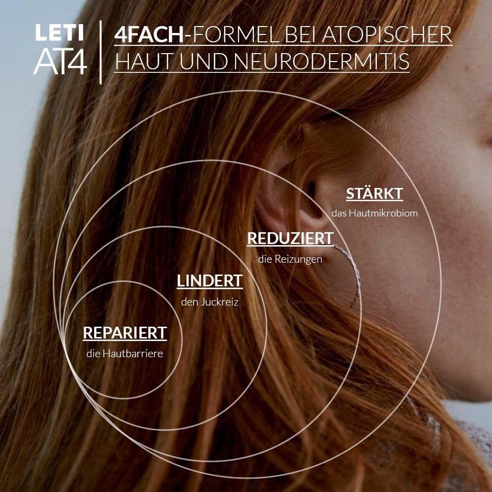 LETI AT4 Shampoo - экстрамягкий шампунь для сухой и склонной к нейродермиту кожи головы. Уменьшает сухость, раздражения, зуд и молочные корки, восстанавливает кожный барьер и баланс микробиома. Подходит для детей от 3 месяцев и взрослых. Не содержит парабенов, протестирован дерматологически и педиатрически.