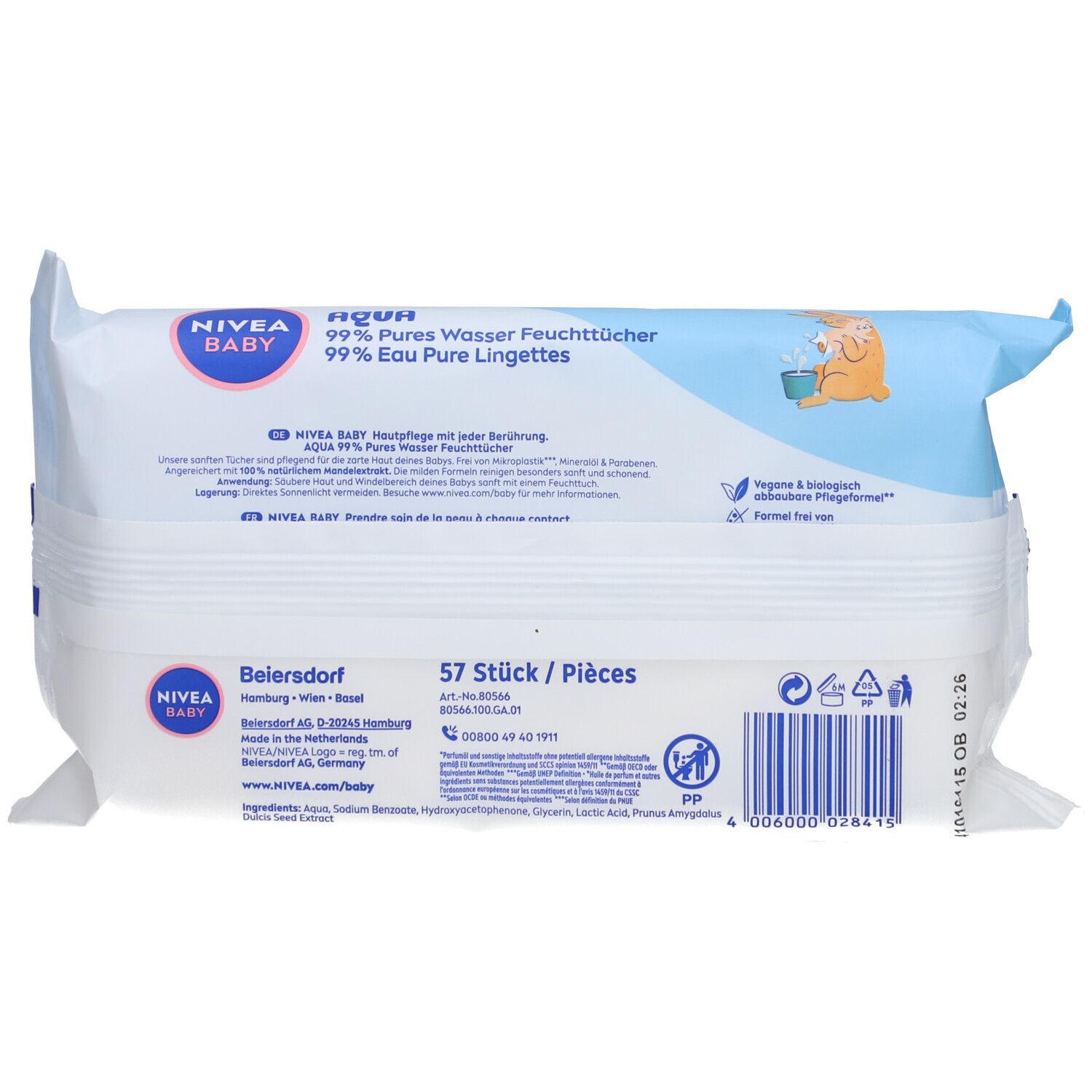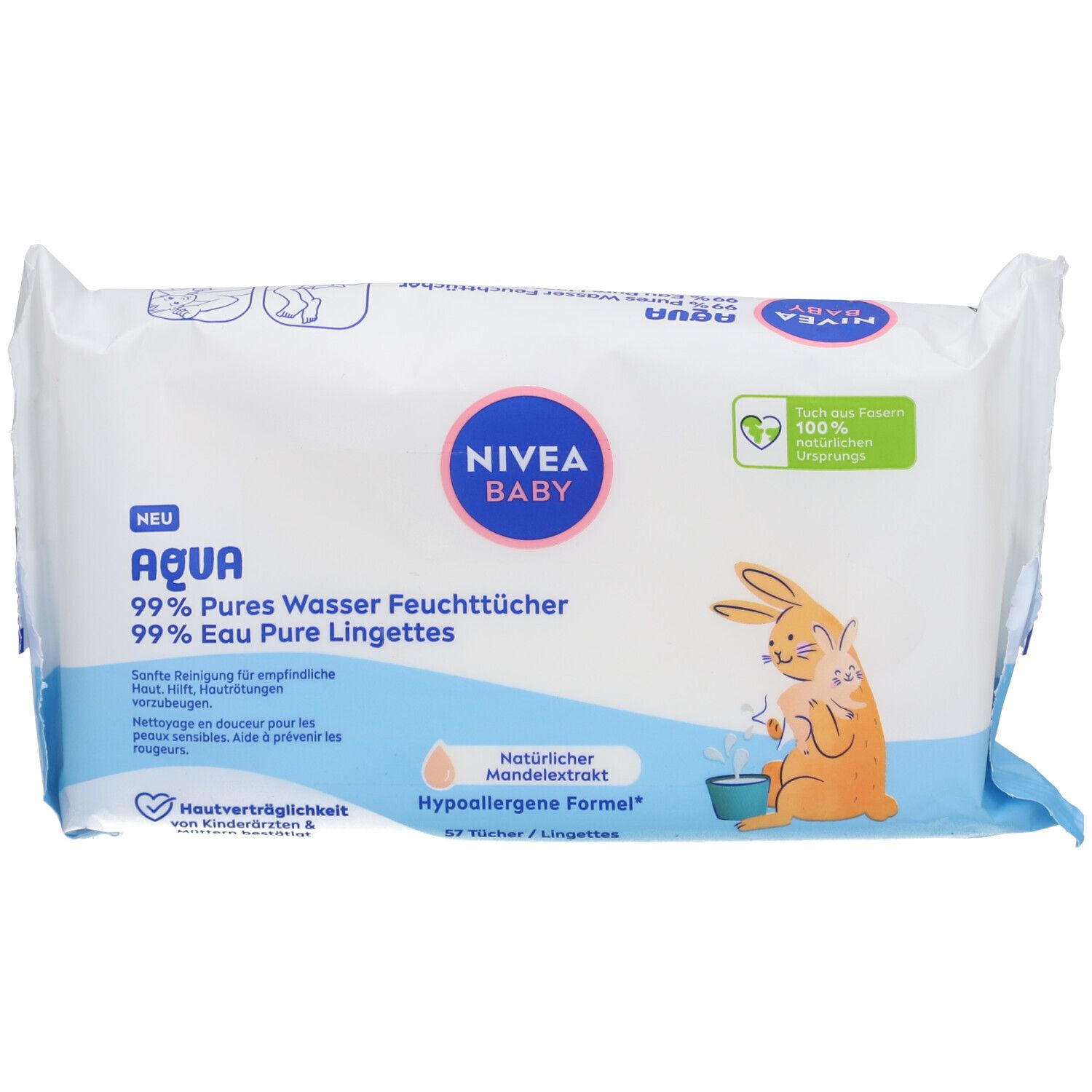 Влажные салфетки NIVEA® BABY Aqua для нежной детской кожи. Содержат 99% воды и 100% натуральный экстракт миндаля. Гипоаллергенная формула без парфюма, животных компонентов, микропластика, минерального масла и парабенов. Подтвержденная дерматологами и мамами безопасность для кожи младенцев.