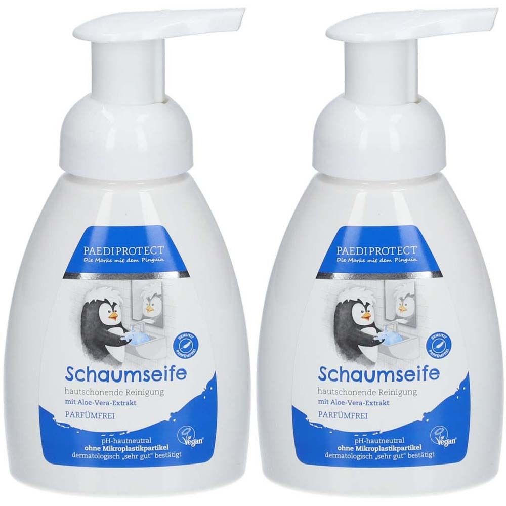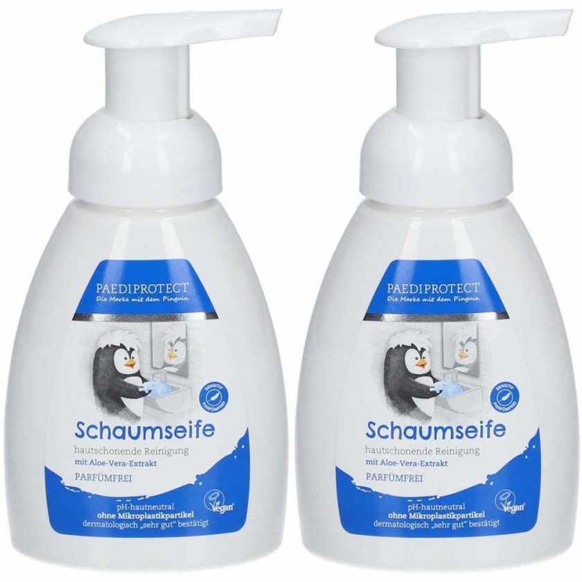 Вебанская пенная мыльная пена PAEDIPROTECT для бережного очищения рук с экстрактом алоэ вера и глицерином. pH-нейтральная формула не нарушает кислотно-щелочной баланс кожи, подходит для детей и взрослых с чувствительной, сухой или склонной к нейродермиту кожей. Без парфюма и микропластика.
