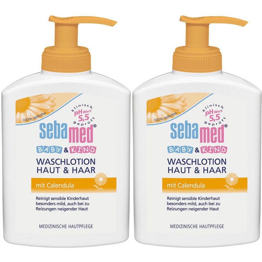 Sebamed Baby & Kind Waschlotion Haut & Haar - мягкая моющая лосьон для кожи и волос детей с календулой, pH 5.5, без мыла и щелочи. Подходит для чувствительной и склонной к раздражениям кожи, включая нейродермит (после консультации с педиатром). Очищает с помощью сахарных тензидов, поддерживает баланс влаги кожи.