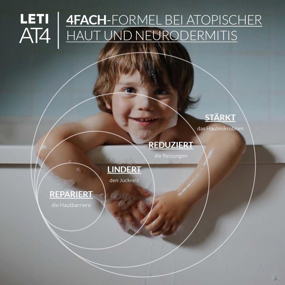 LETI AT4 Dusch- und Badegel - экстрамягкий и восстанавливающий гель для душа и ванны для сухой кожи и кожи, склонной к нейродермиту. Успокаивает кожу, снимает зуд, восстанавливает кожный барьер и балансирует микробиом кожи. Подходит для детей от 3 месяцев и взрослых.