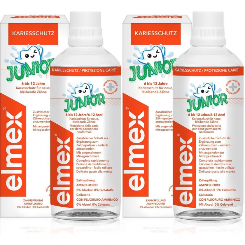 Детская зубная жидкость для полоскания рта elmex Junior для детей 6-12 лет. Обеспечивает эффективную защиту от кариеса для постоянных зубов, содержит аминофторид, который создает защитный щит вокруг зубов. Без алкоголя и добавок, с мягким мятным вкусом. Особенно рекомендуется детям с брекетами.