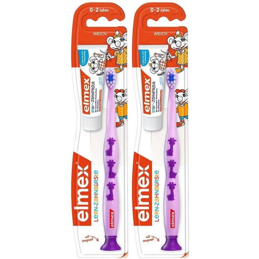 elmex Lern-Zahnbürste - детская зубная щетка для детей от 0 до 2 лет с мягкими щетинками и эргономичной ручкой, специально разработанная для бережной чистки первых зубов. В наборе 2 щетки разных цветов.