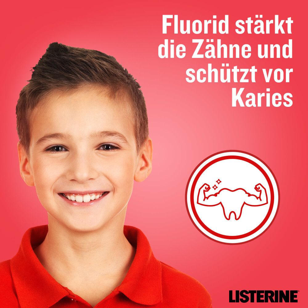 Детская фторидсодержащая жидкость для полоскания рта LISTERINE Smart Kidz Mild Berry для защиты от кариеса у детей от 6 лет. Антибактериальное действие, без алкоголя и сахара, с приятным ягодным вкусом. Укрепляет зубы и снижает риск кариеса на 40% по сравнению с одной только чисткой зубов