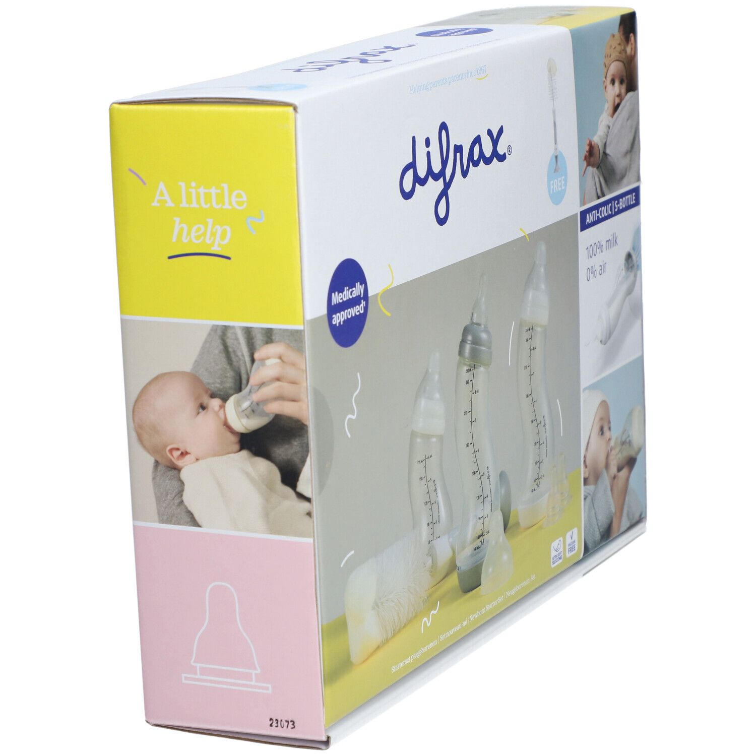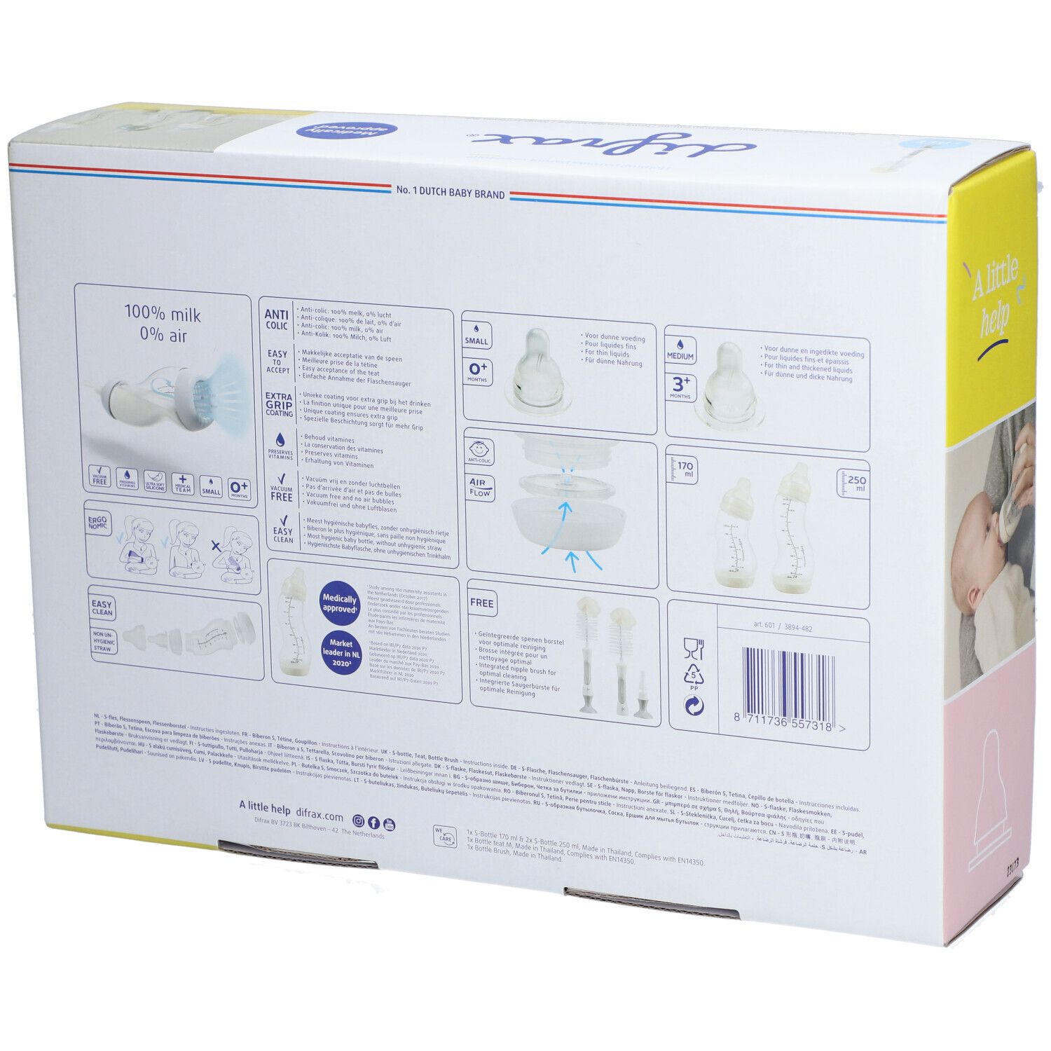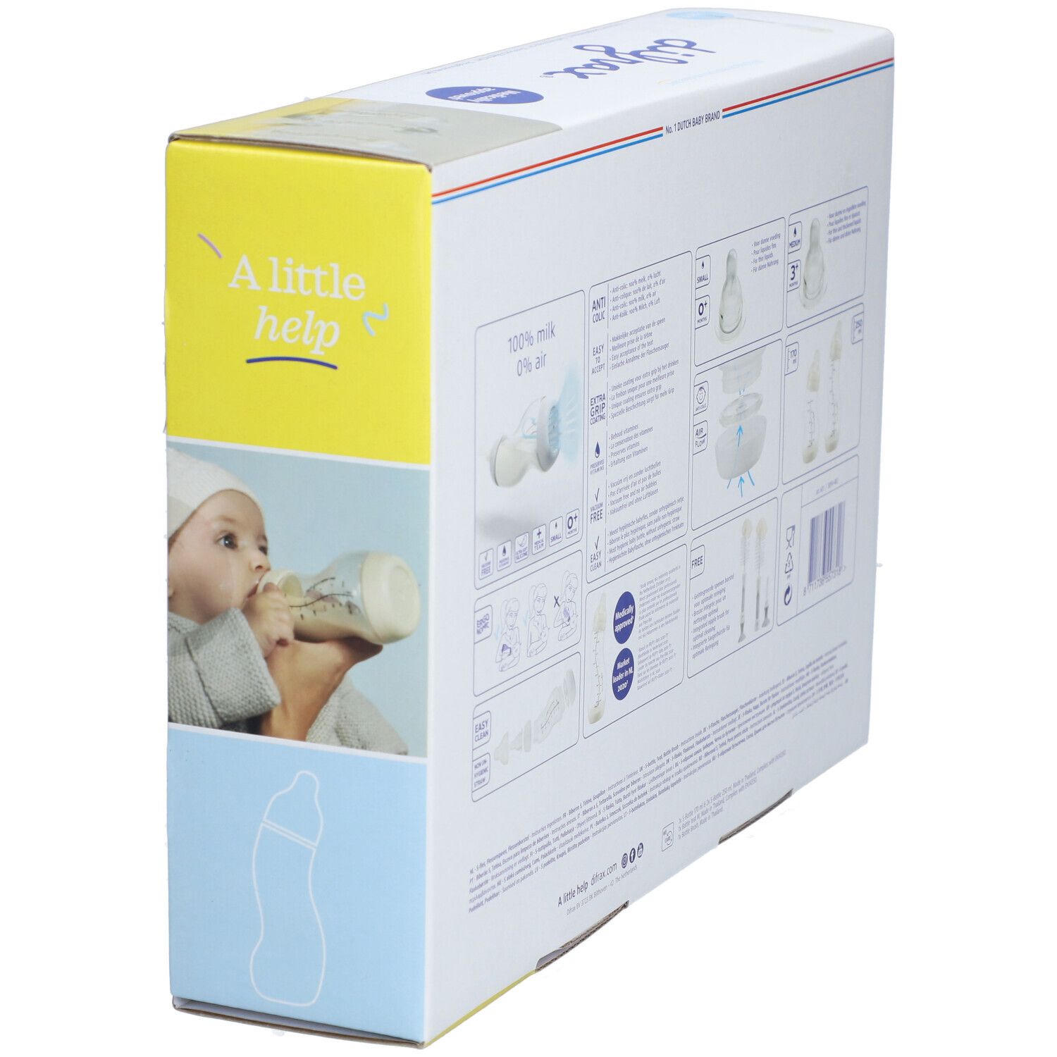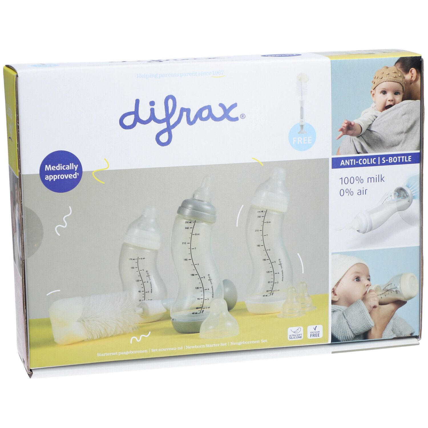 Набор для новорожденных Difrax включает 3 бутылочки с антиколиковым клапаном (170 мл и 2x250 мл), 2 средние соски и щетку для чистки. Идеально подходит для комбинирования грудного вскармливания и кормления из бутылочки.