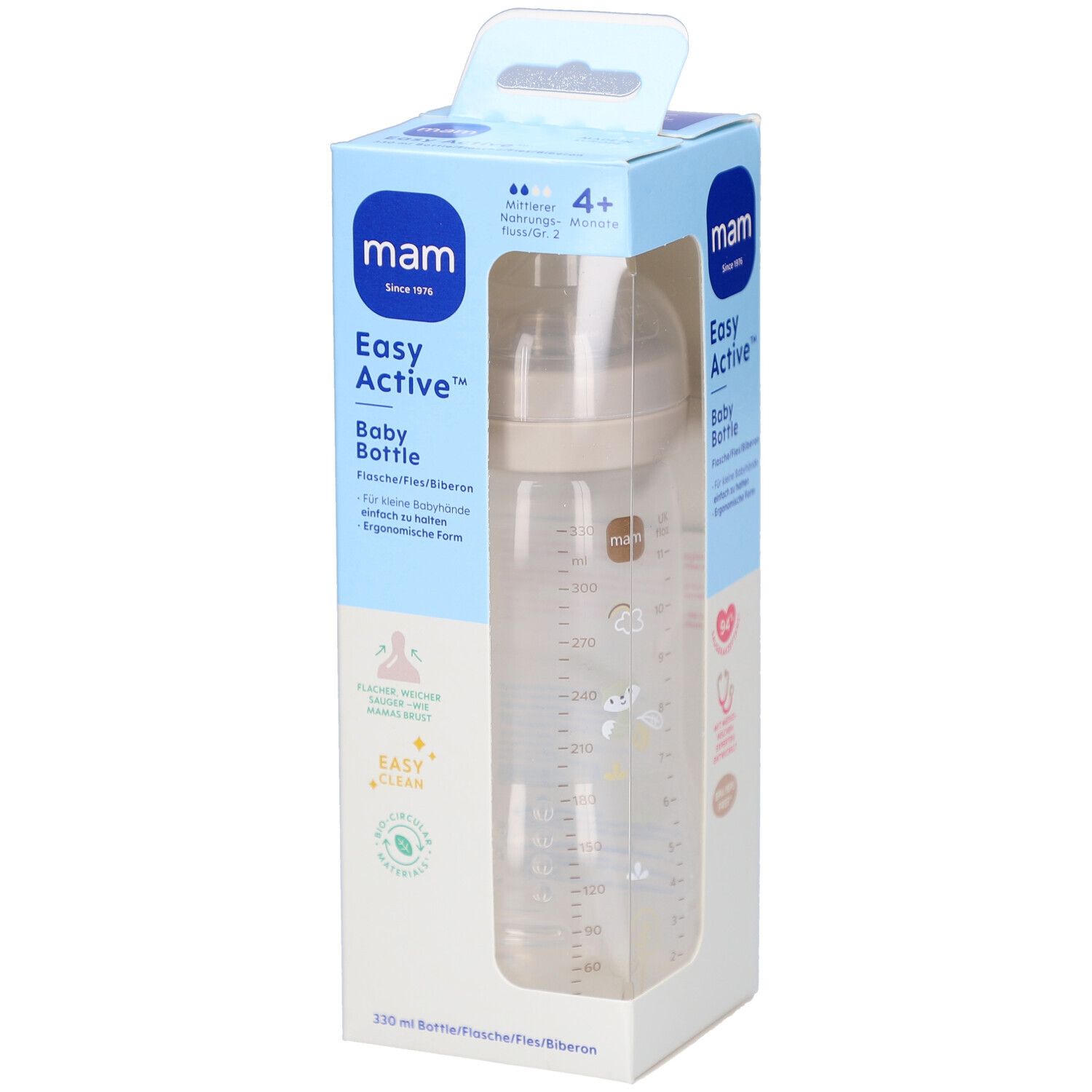 Детская бутылочка Easy Active™ объемом 330 мл с эргономичной формой для удобного удержания маленькими руками. Имеет плоский мягкий сосок, имитирующий материнскую грудь, который принимают 94% младенцев. Большие отверстия для легкого наполнения и очистки. Подходит для новорожденных и младенцев с системой размеров сосок от 0 до X.