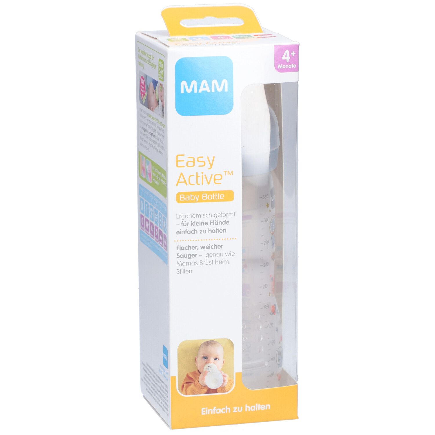 Детская бутылочка MAM Easy Active для активных малышей от 4 месяцев с эргономичной формой, плоским мягким соском, имитирующим материнскую грудь, и широким горлышком для легкого наполнения и очистки