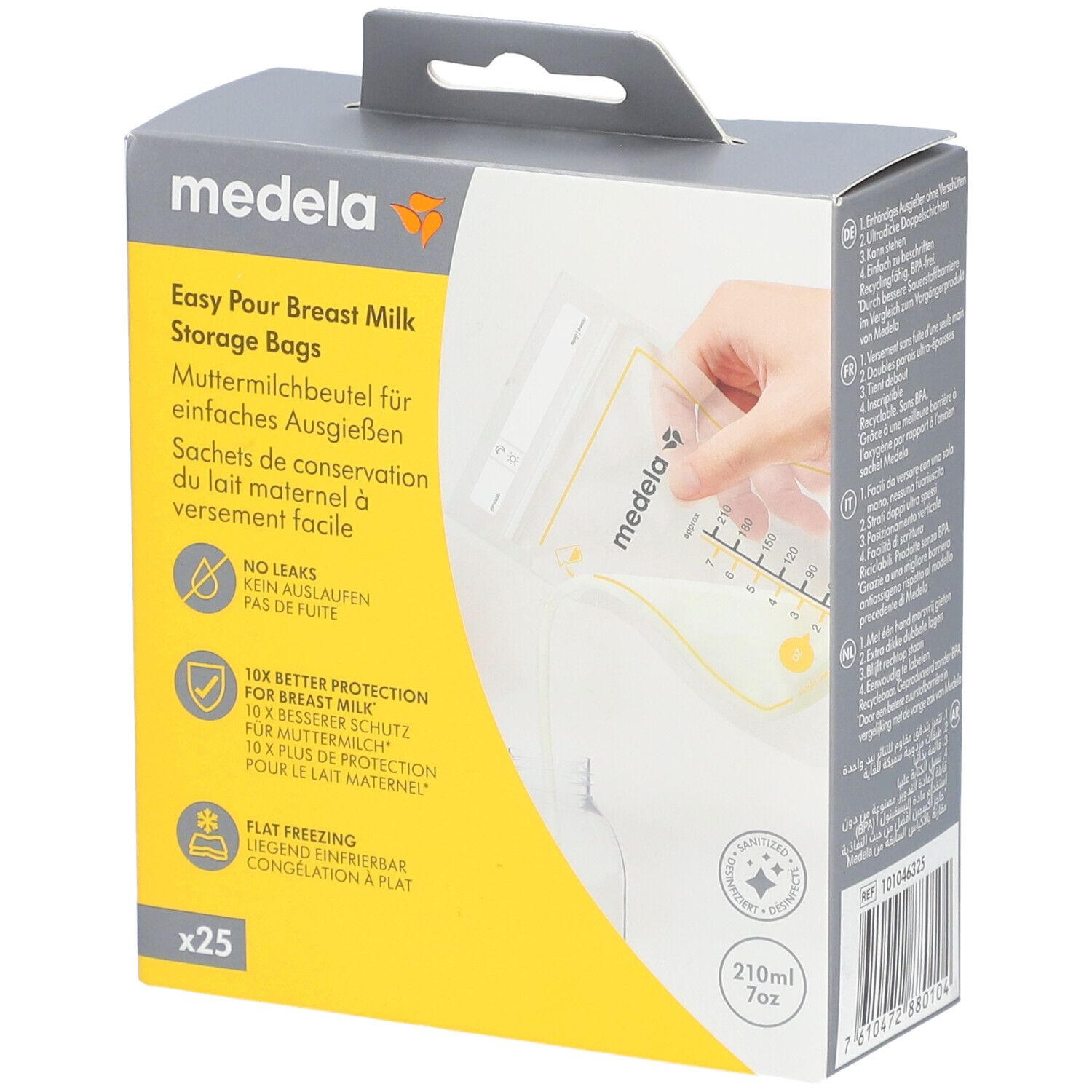 Пакеты для хранения грудного молока Medela объемом 210 мл с двойным замком от протекания, термосварными швами, возможностью вертикального заполнения и специальным отверстием для удобного переливания. В комплекте транспортировочный чехол для чистого хранения.
