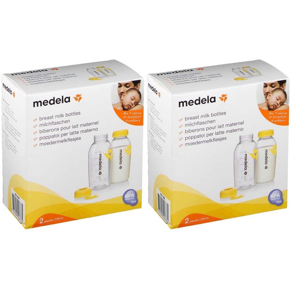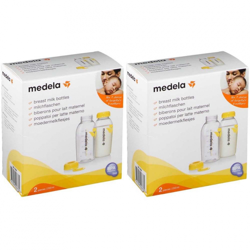Набор из 2 бутылочек Medela 250 мл для сцеживания, хранения и кормления грудным молоком. Совместимы со всеми молокоотсосами Medela, изготовлены из безопасного полипропилена без бисфенола-А.
