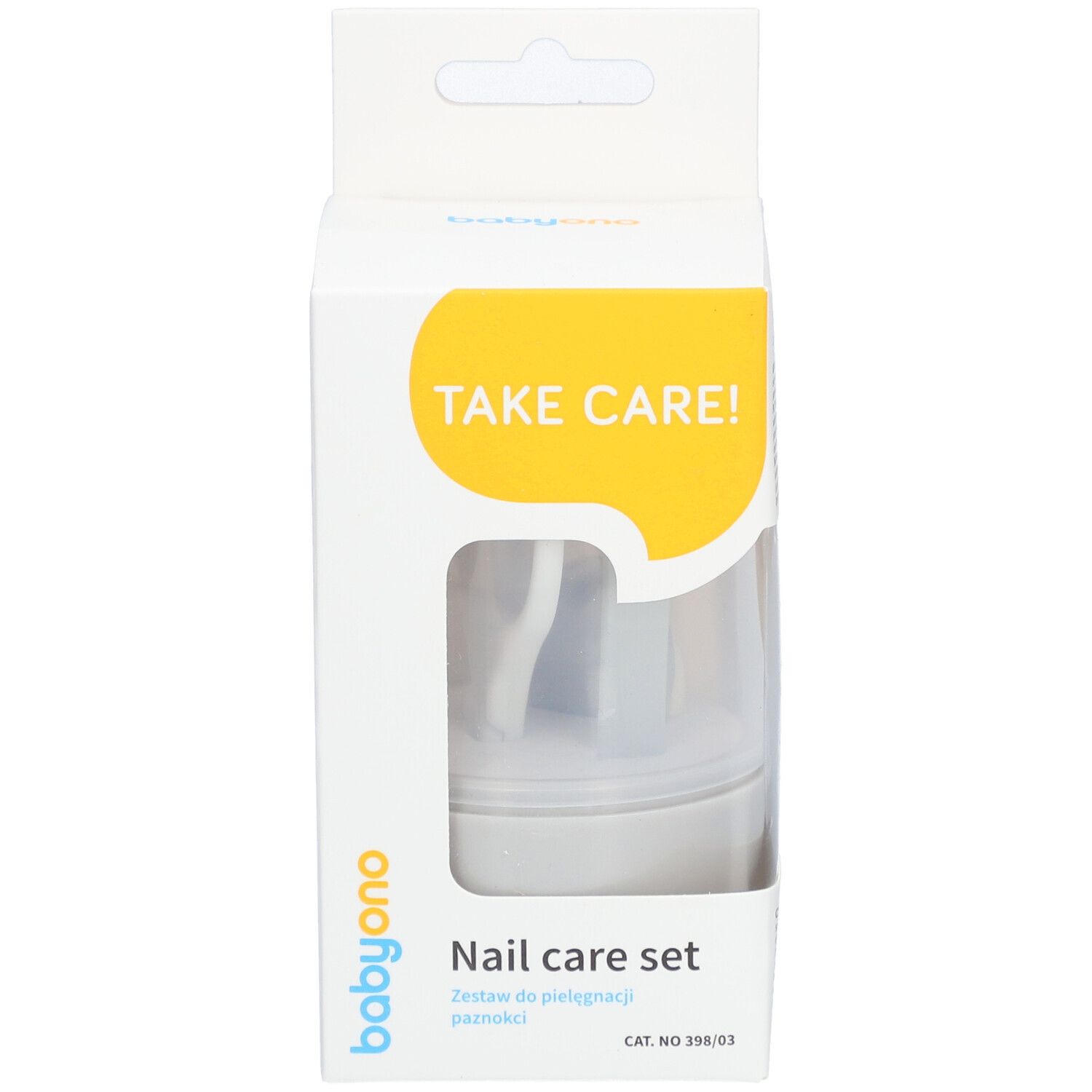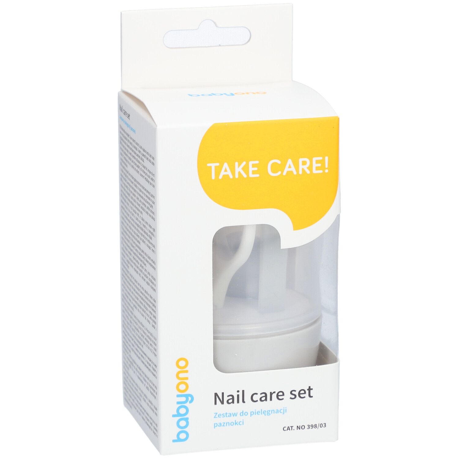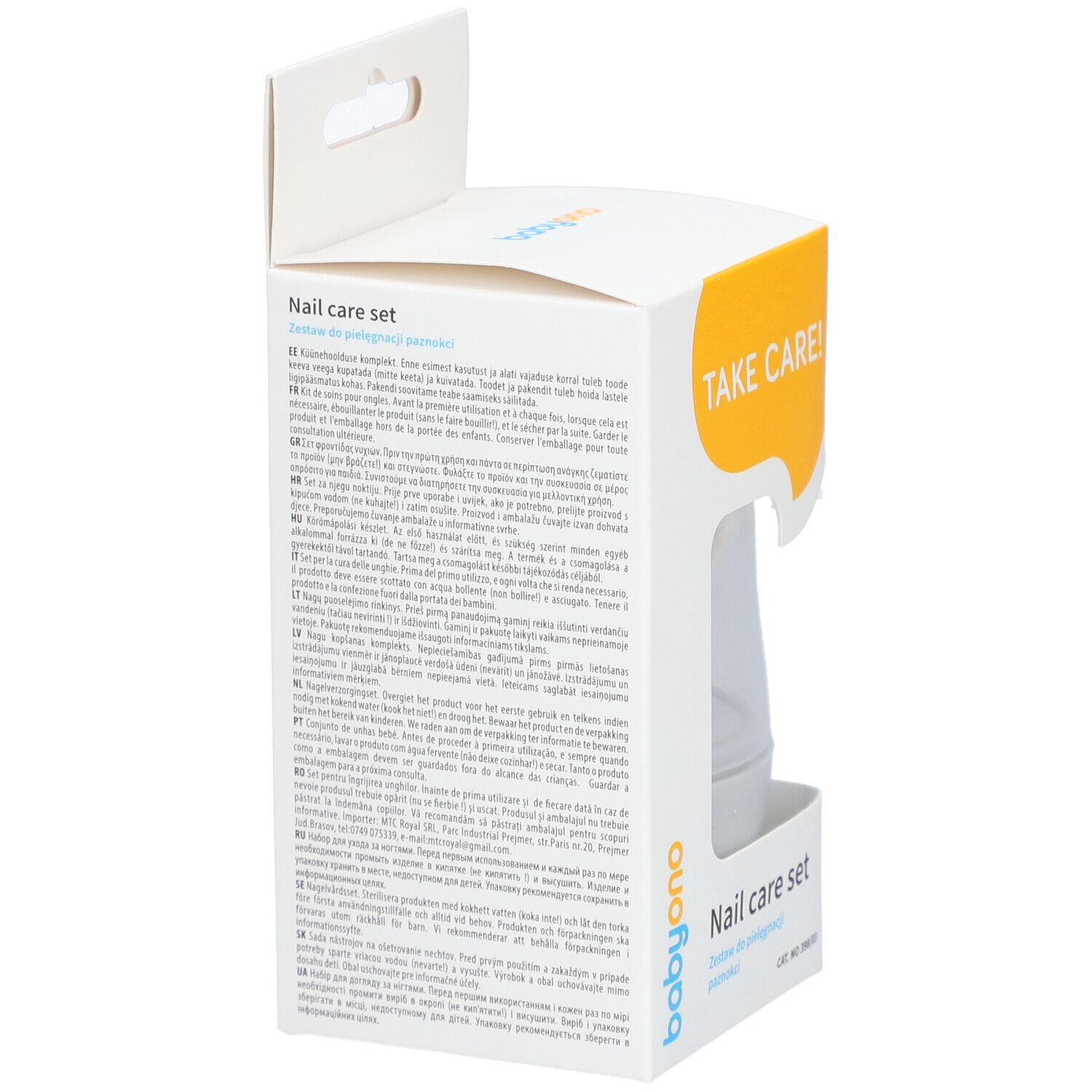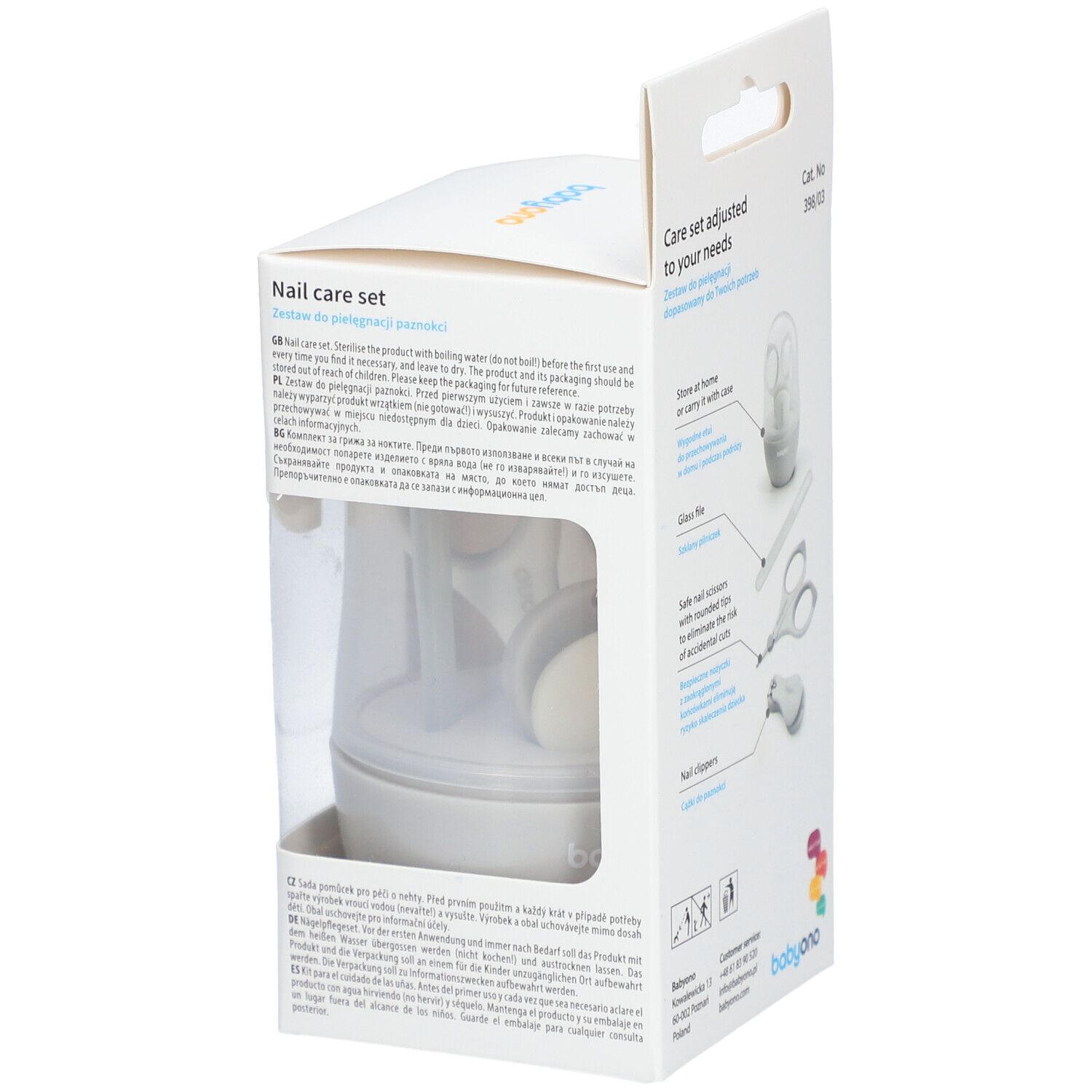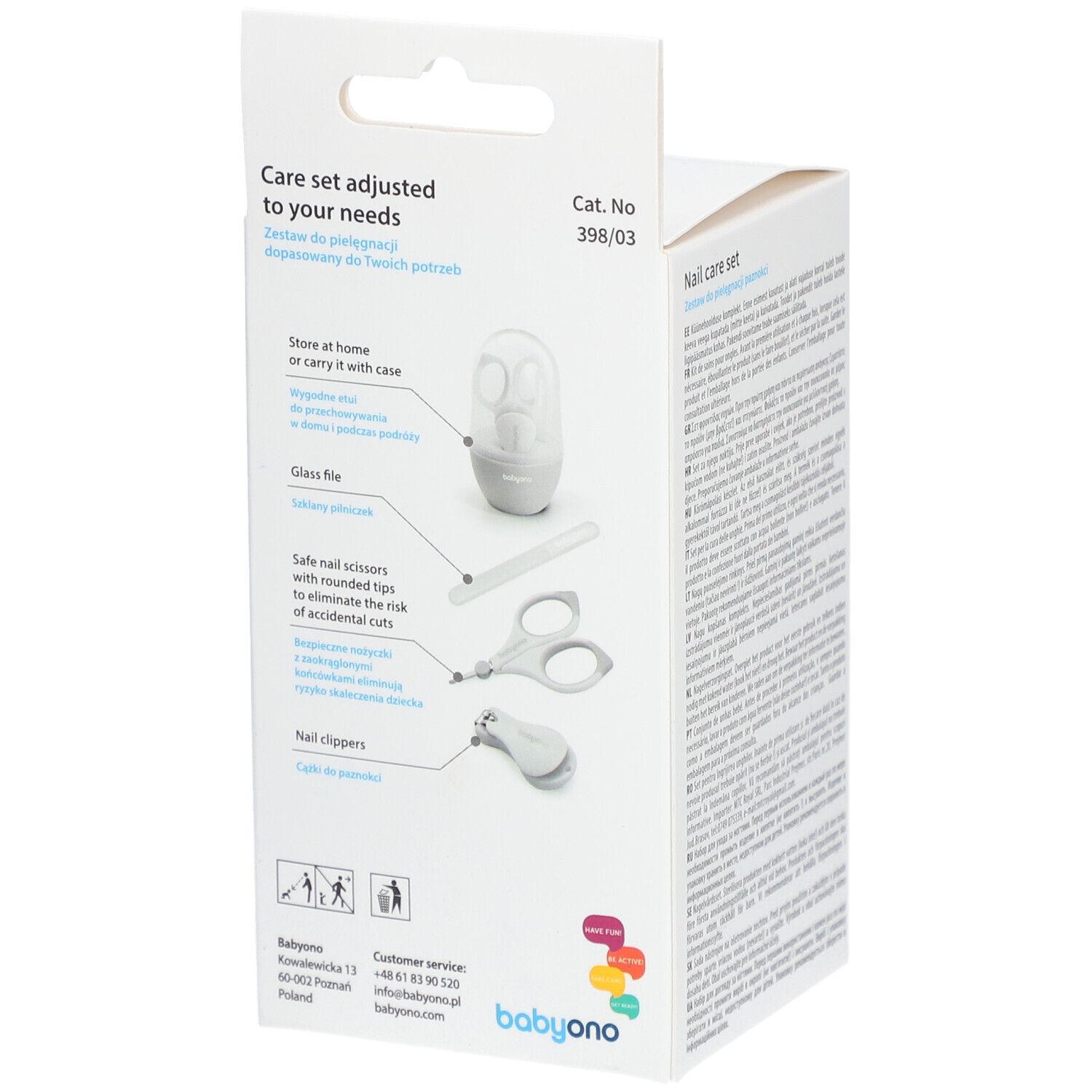 Комплект для ухода за ногтями новорожденных babyono включает гигиенические ножницы из нержавеющей стали с закругленными концами, щипчики из хромированной стали и стеклянную пилочку для сглаживания краев. Все инструменты хранятся в удобном футляре для гигиеничного хранения и транспортировки.