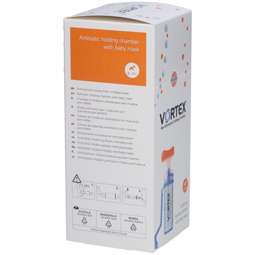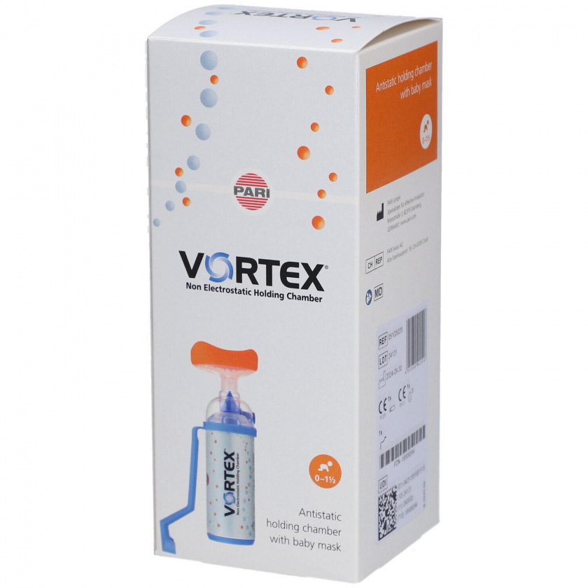 Ингаляционная камера VORTEX с детской маской для младенцев 0-1,5 года. Помогает правильно проводить ингаляции с дозированными аэрозолями, устраняя проблемы координации при вдыхании. Обеспечивает эффективную доставку лекарства в легкие.