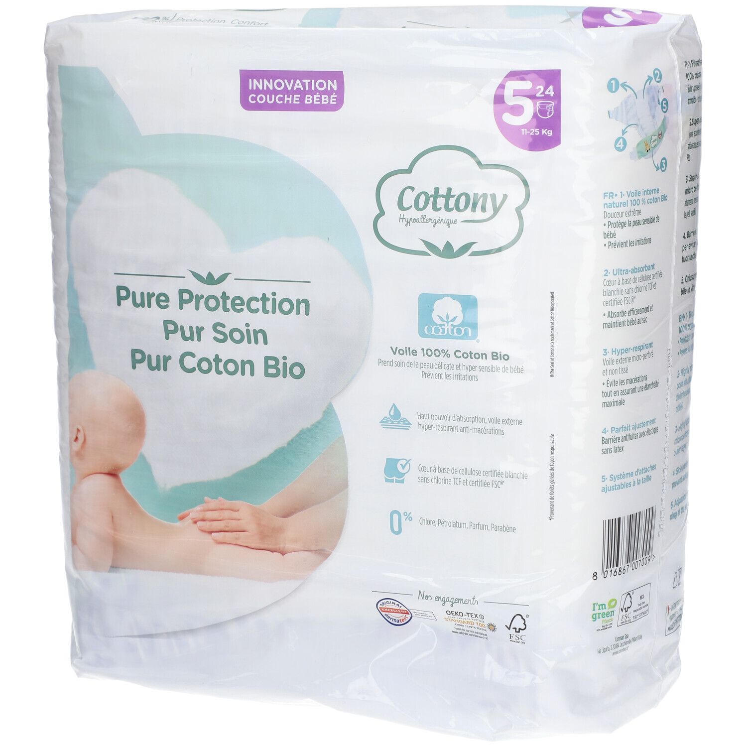 Хлопковые подгузники Cottony размера 5 для детей весом 11-25 кг. Изготовлены из 100% органического хлопка, мягкие на ощупь, предотвращают раздражения. Без хлора и отдушек, хорошо впитывают, идеальны для чувствительной кожи. Дерматологически протестированы.