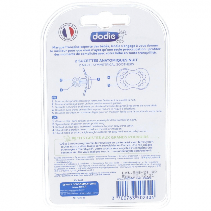 Анатомические соски-пустышки dodie® Duo для детей от 18 месяцев. Набор из 2 пустышек с фосфоресцирующей кнопкой для ночного поиска, удобным щитком из Tritan и вентиляционными отверстиями для предотвращения раздражения кожи.