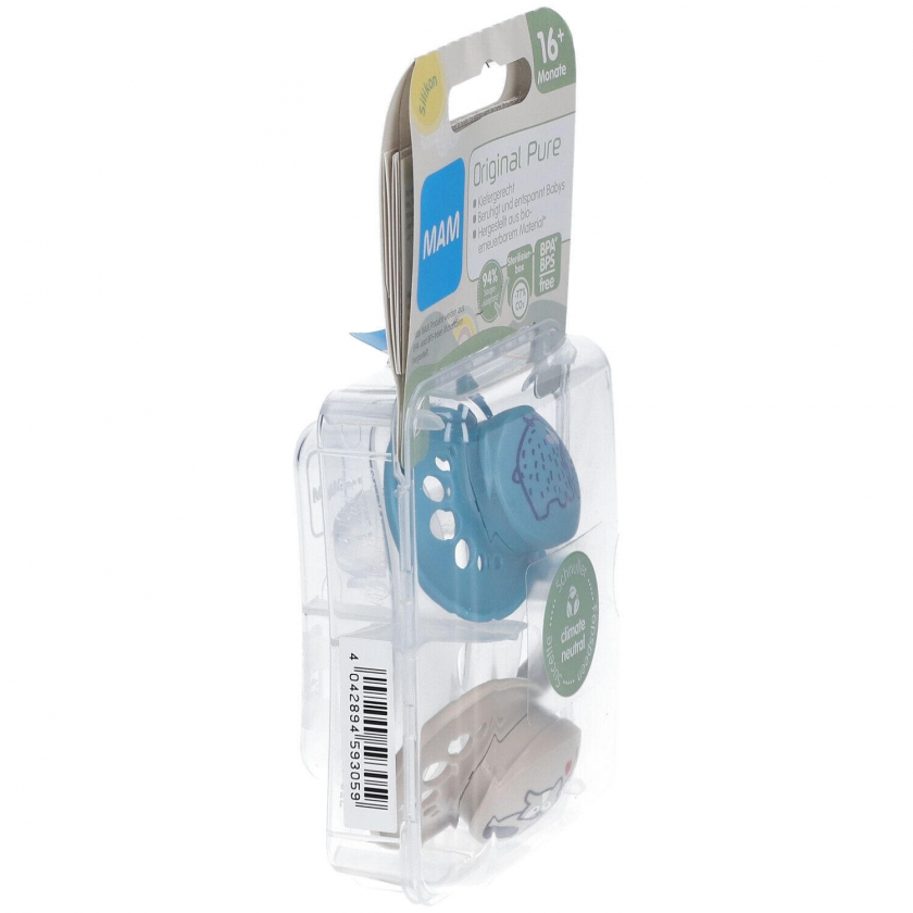 Набор из 2 ортодонтических силиконовых сосок-пустышек MAM Original Pure для детей от 16 месяцев с транспортной и стерилизационной коробкой. Симметричный плоский дизайн разработан совместно со стоматологами для здорового развития зубов, имеет большие отверстия для дыхания кожи и уникальные MAM отверстия на внутренней стороне.