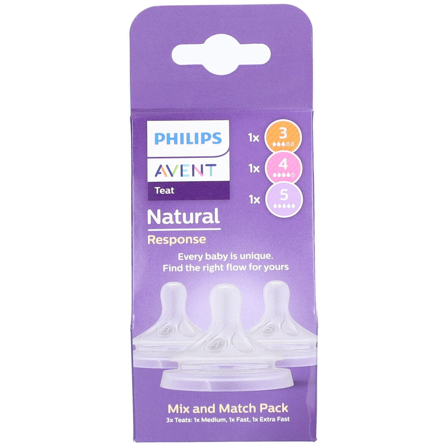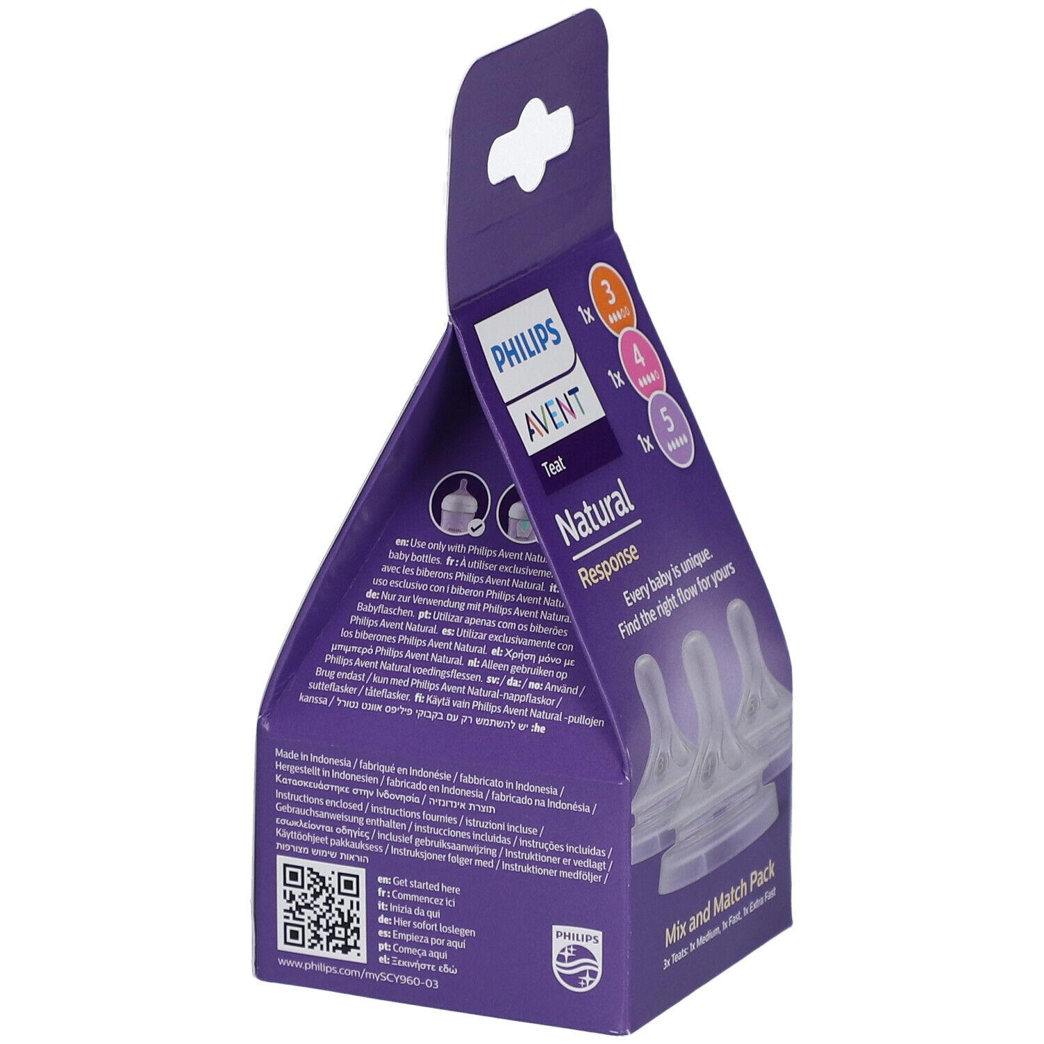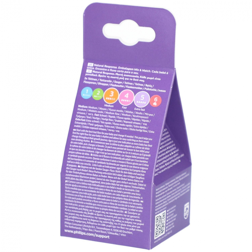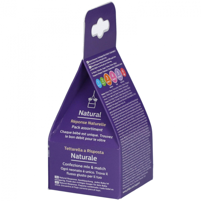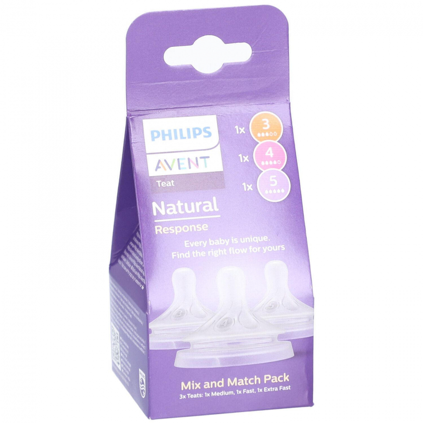Набор сосок Philips Avent Natural Response Mix und Match Pack для подбора оптимальной скорости потока при кормлении из бутылочки. Включает 3 соски с разной скоростью потока (средняя, быстрая, очень быстрая). Соски имитируют естественное грудное кормление, имеют антиколиковый клапан и предотвращают протекание молока.