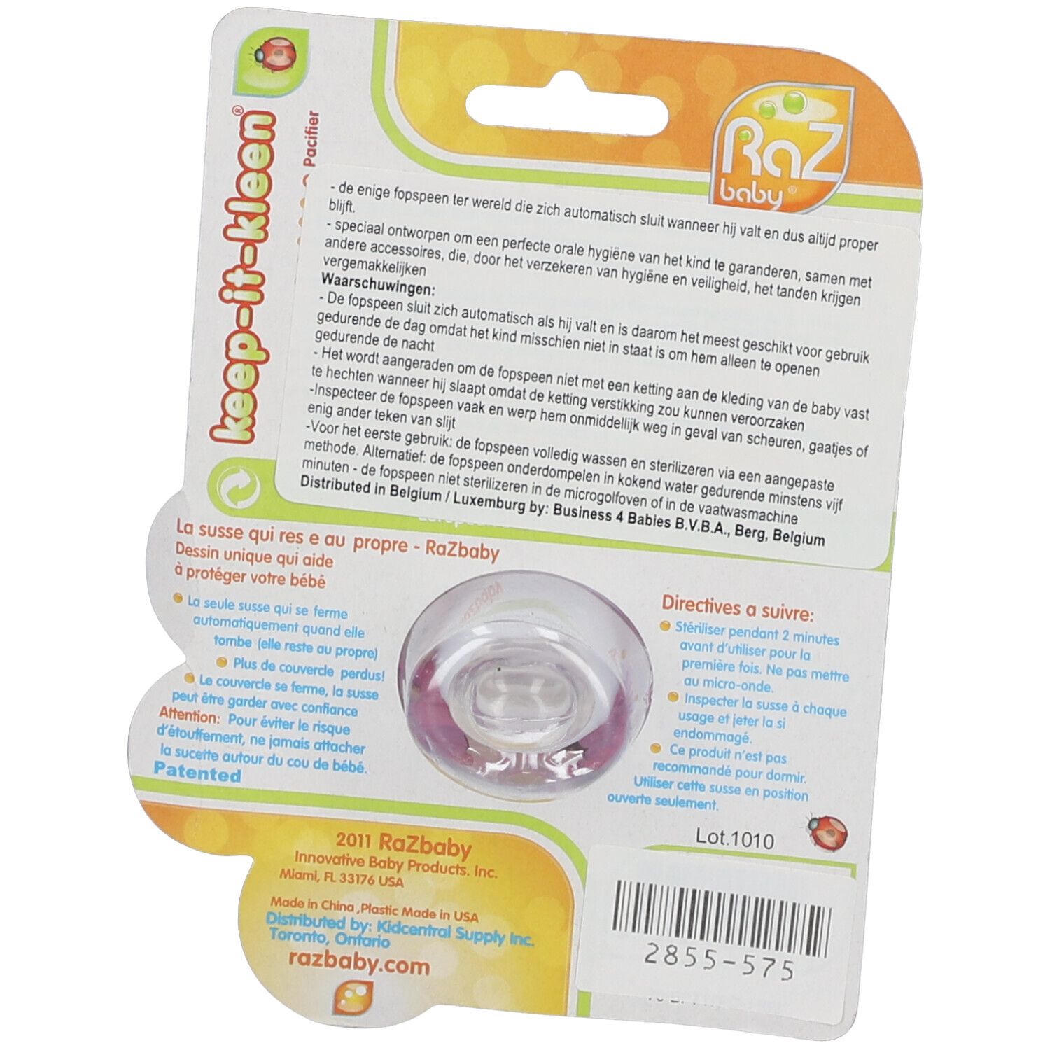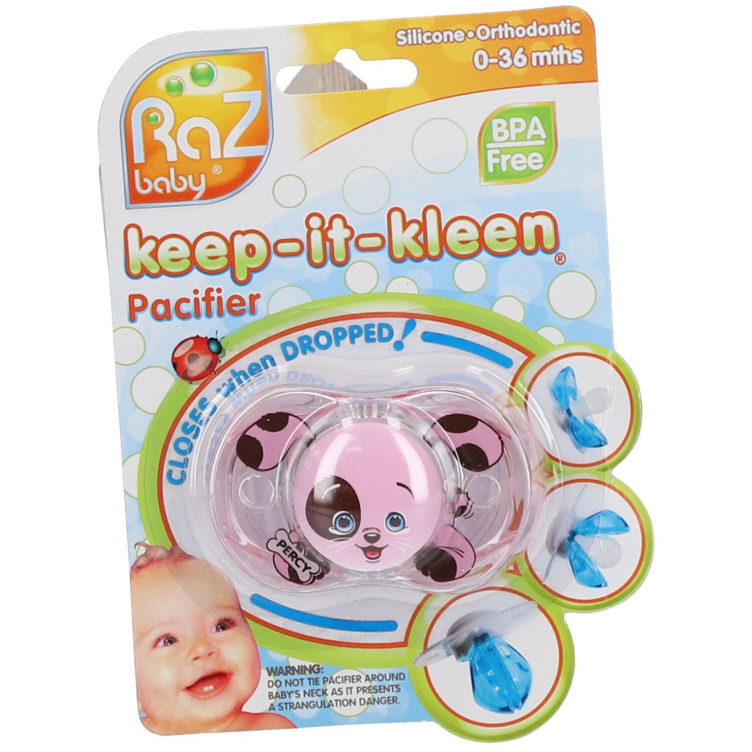 Соска-пустышка Raz Baby Pink Puppy с уникальной системой закрывания при падении для поддержания гигиены. Ортодонтический силиконовый сосок, подходит для детей от 0 до 36 месяцев, не содержит BPA. Щиток прикреплен к соске, что предотвращает его потерю.