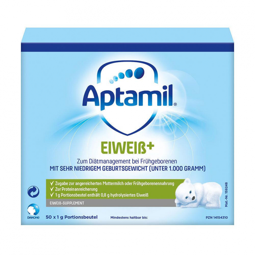 Aptamil Eiweiß+ - белковая добавка для недоношенных детей с очень низкой массой тела при рождении (менее 1000 г). Содержит гидролизованный белок для обогащения грудного молока или специализированного питания. Используется под медицинским контролем для диетического управления питанием недоношенных детей.