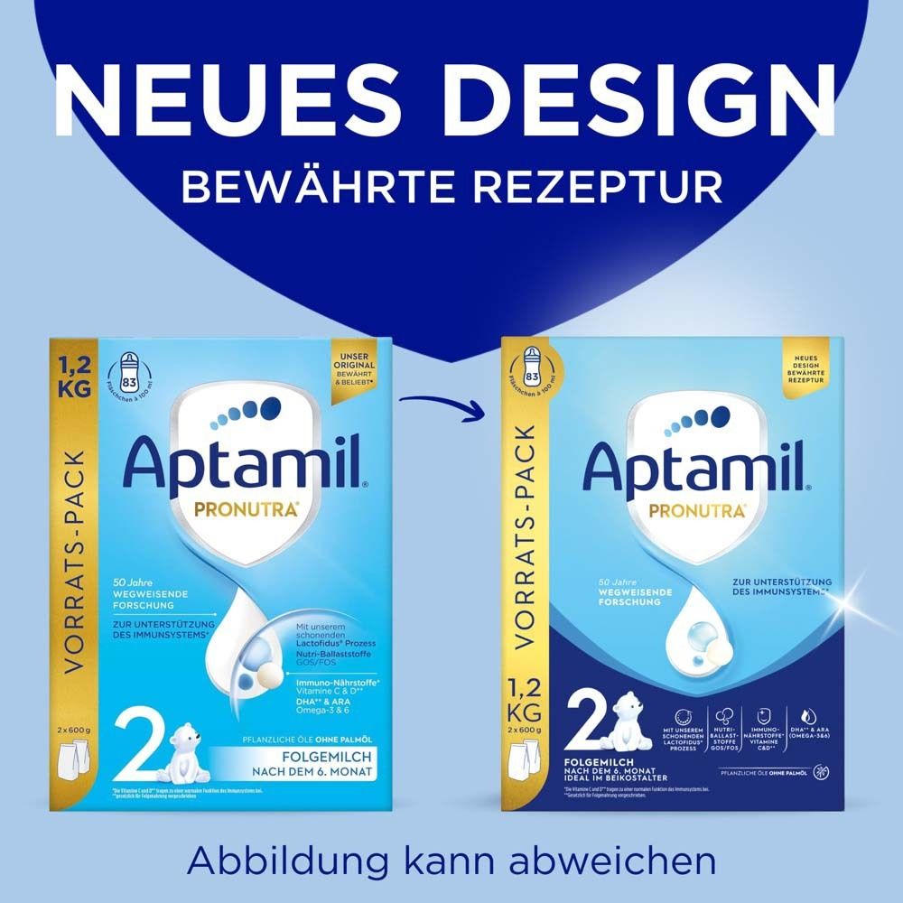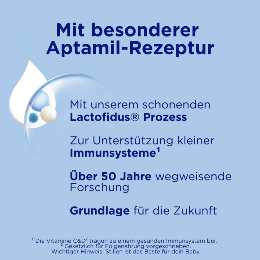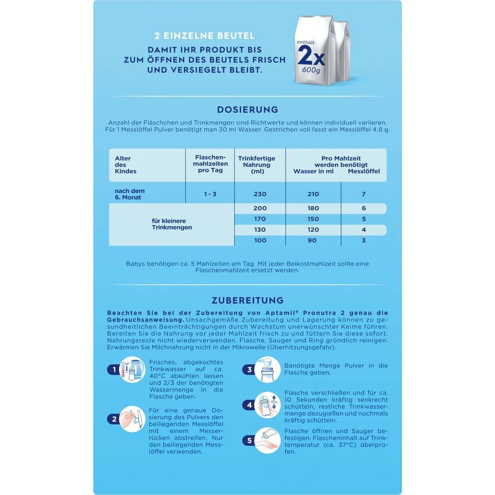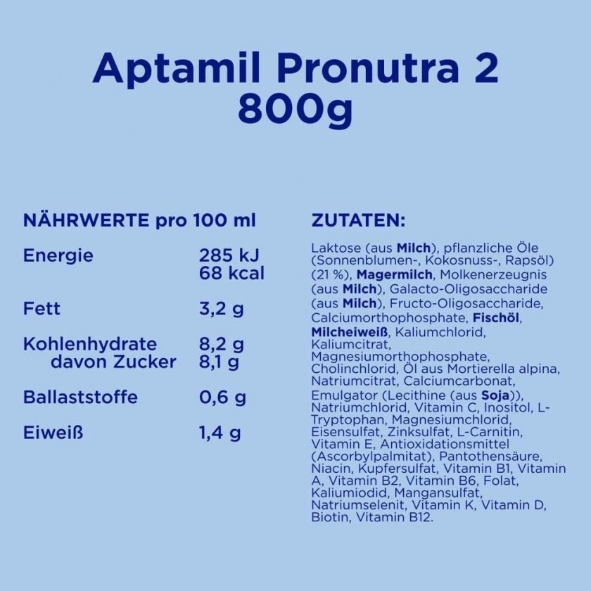 Детская молочная смесь Aptamil Folgemilch 2 Pronutra+ для питания детей после 6 месяцев. Содержит запатентованную формулу Pronutra+ с GOS/FOS для поддержки иммунитета, DHA для развития мозга и глаз, витамин D и кальций для роста костей, железо для когнитивного развития. Без добавления сахара и искусственных ароматизаторов.