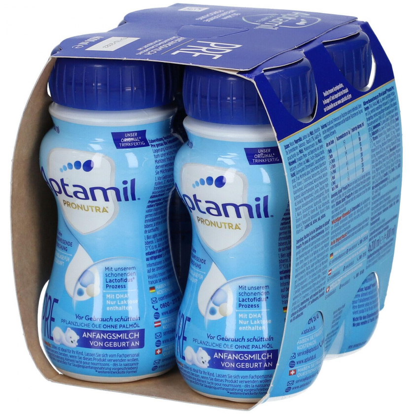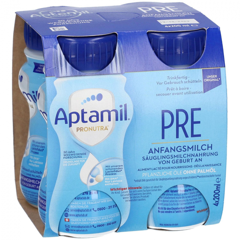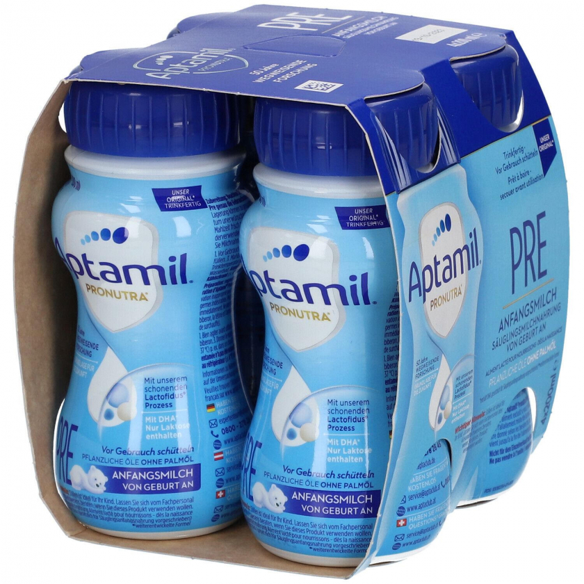 Готовая к употреблению молочная смесь Aptamil® Pre для новорожденных с рождения, содержащая лактозу, DHA и пребиотики GOS/FOS. Подходит для полного питания младенцев при невозможности грудного вскармливания. Производится в Швейцарии компанией Nutricia с использованием запатентованной формулы Pronutra.