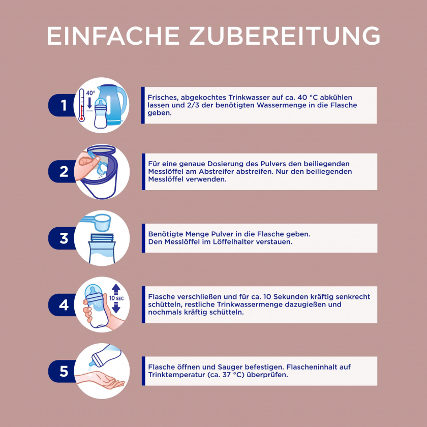 Состав: Лактоза (из молока), обезжиренное молоко, деминерализованная сыворотка (из молока), молочный жир, растительные масла (рапсовое, подсолнечное, кокосовое), галактоолигосахариды (из молока), концентрат сыворотки (из молока), сывороточный белок (из молока), 2'фукозиллактоза, фруктоолигосахариды, рыбий жир, ортофосфат кальция, масло Mortierella alpina, хлорид калия, цитрат натрия, холинхлорид, цитрат калия, витамин C, хлорид магния, эмульгатор (соевый лецитин), инозитол, таурин, сульфат железа-II, L-карнитин, сульфат цинка, витамин E, нуклеотиды (натриевые соли уридин-, цитидин-, аденозин-, инозин-, гуанозин-5-монофосфата), антиоксидант (аскорбилпальмитат), пантотеновая кислота, ниацин, L-триптофан, карбонат кальция, сульфат меди, витамин B₁, витамин A, витамин B₂, витамин B₆, фолиевая кислота, йодид калия, селенит натрия, сульфат марганца-II, витамин K, витамин D, биотин, витамин B₁₂