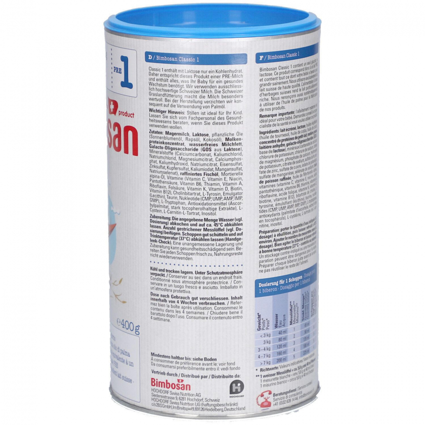 Bimbosan Classic 1 - детская молочная смесь для новорожденных с рождения, соответствующая PRE-стандарту. Содержит только лактозу в качестве углевода, без пальмового масла и крахмала. Произведена из высококачественного швейцарского молока, содержит галактоолигосахариды, нуклеотиды, витамины и минералы для здорового роста ребенка.