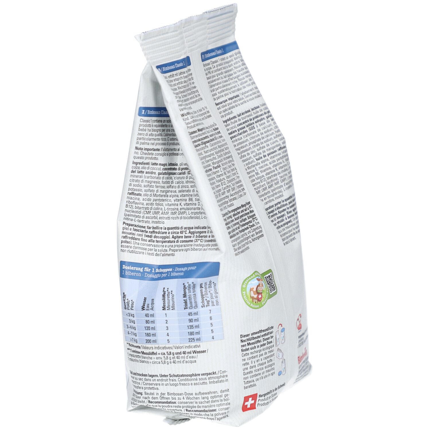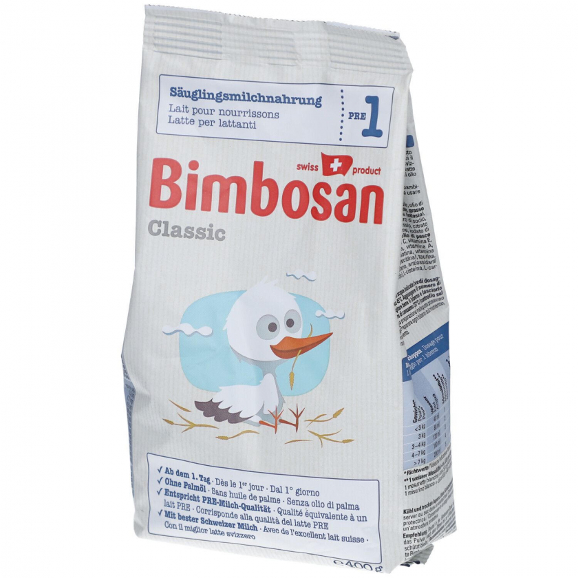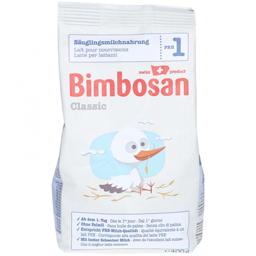 Bimbosan Classic PRE-Milch - детская молочная смесь премиум-класса для новорожденных с рождения. Производится в Швейцарии из высококачественного молока без пальмового масла. Содержит лактозу как единственный углевод, оптимальный белковый состав и важные жирные кислоты для здорового развития ребенка.