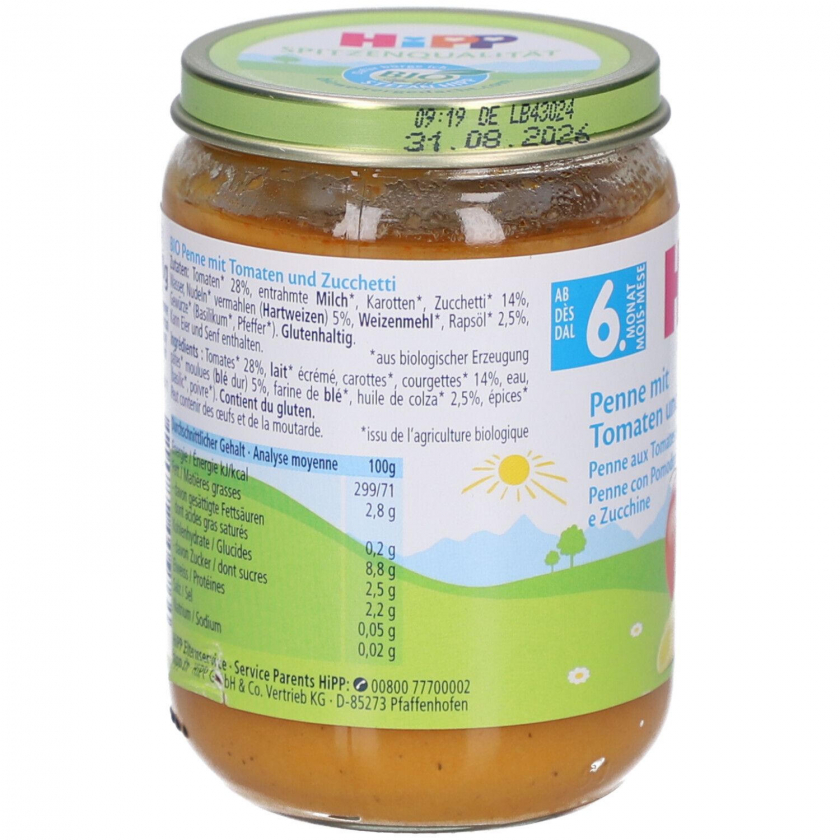 Органическое детское питание HiPP с пенне, томатами и цуккини для детей от 6 месяцев. Полноценная готовая мясо-овощная каша без добавления соли, приготовленная из натуральных ингредиентов органического земледелия. Подходит для расширения рациона питания малышей