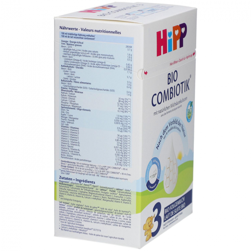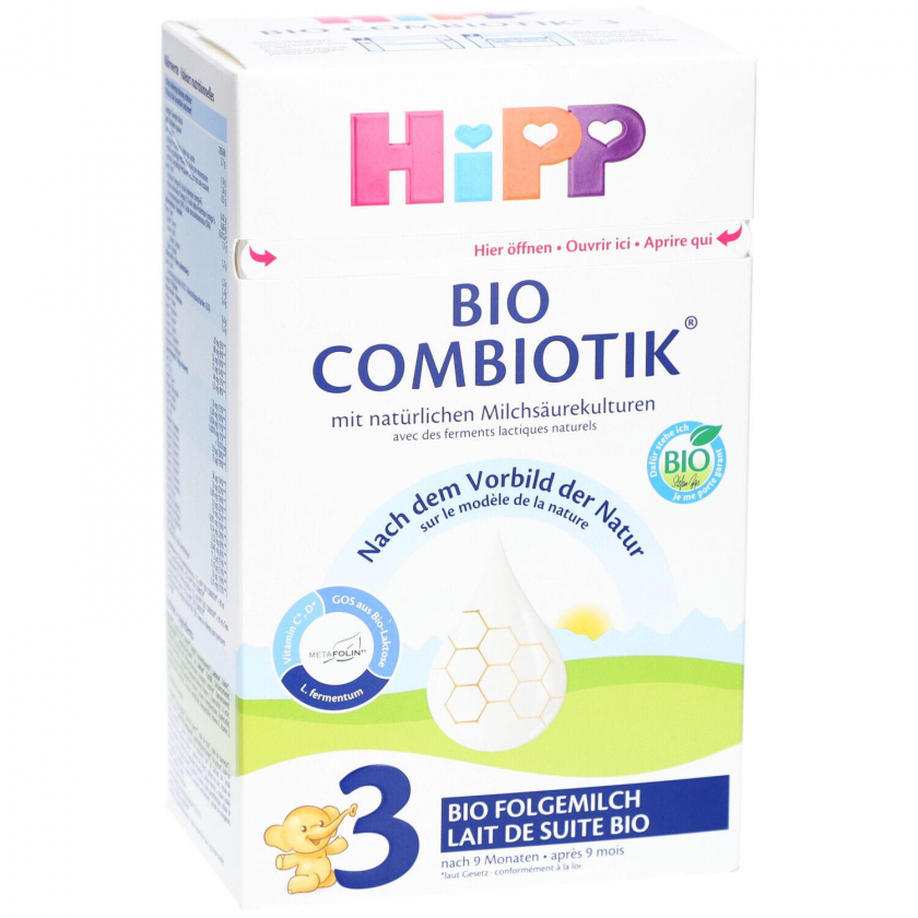 Органическая последующая молочная смесь HiPP Bio Combiotik 3 для детей от 9 месяцев с натуральными молочнокислыми культурами и GOS. Содержит важные витамины C, D, E, поддерживает иммунитет и сбалансированное питание. Без пальмового масла, на основе тщательно отобранного органического молока.