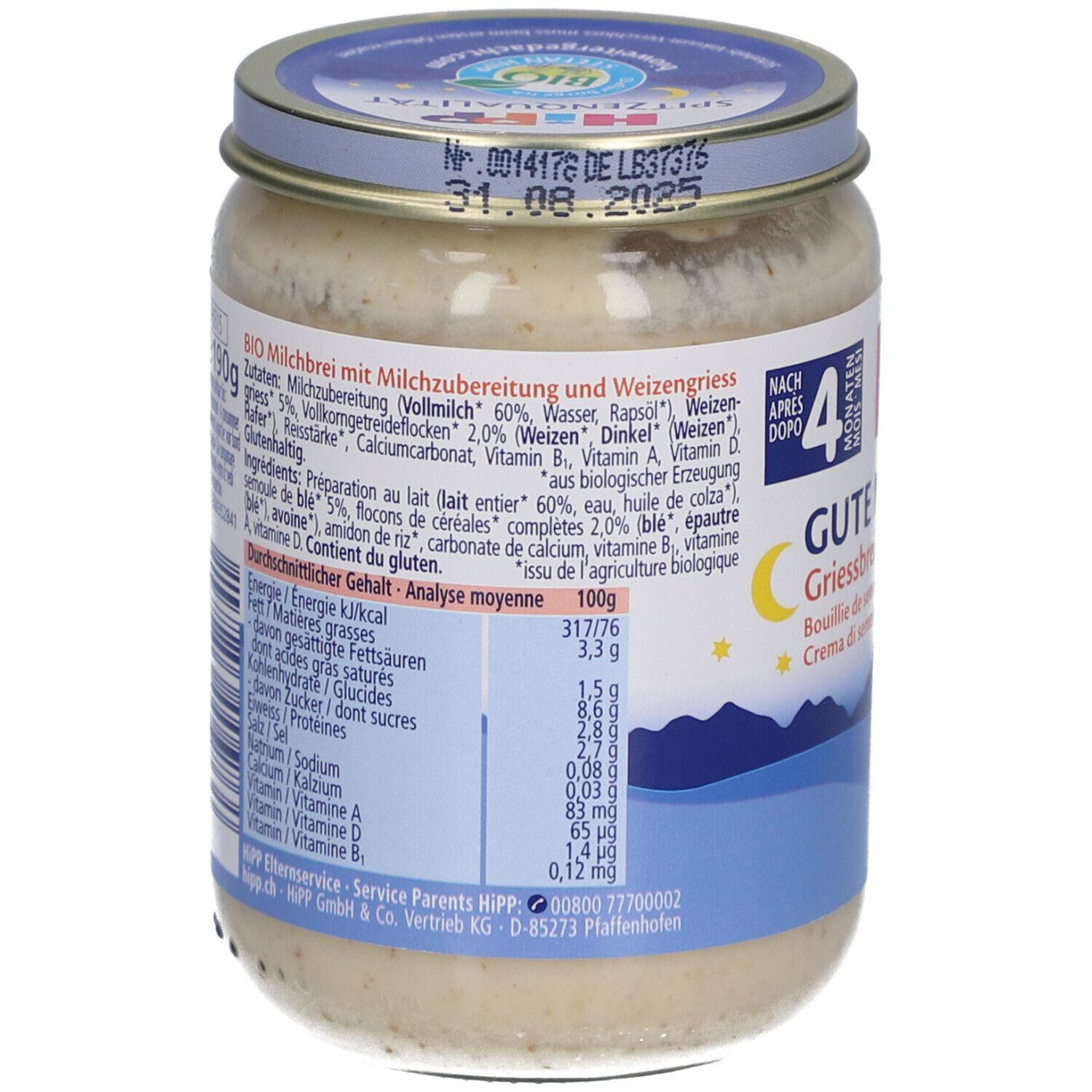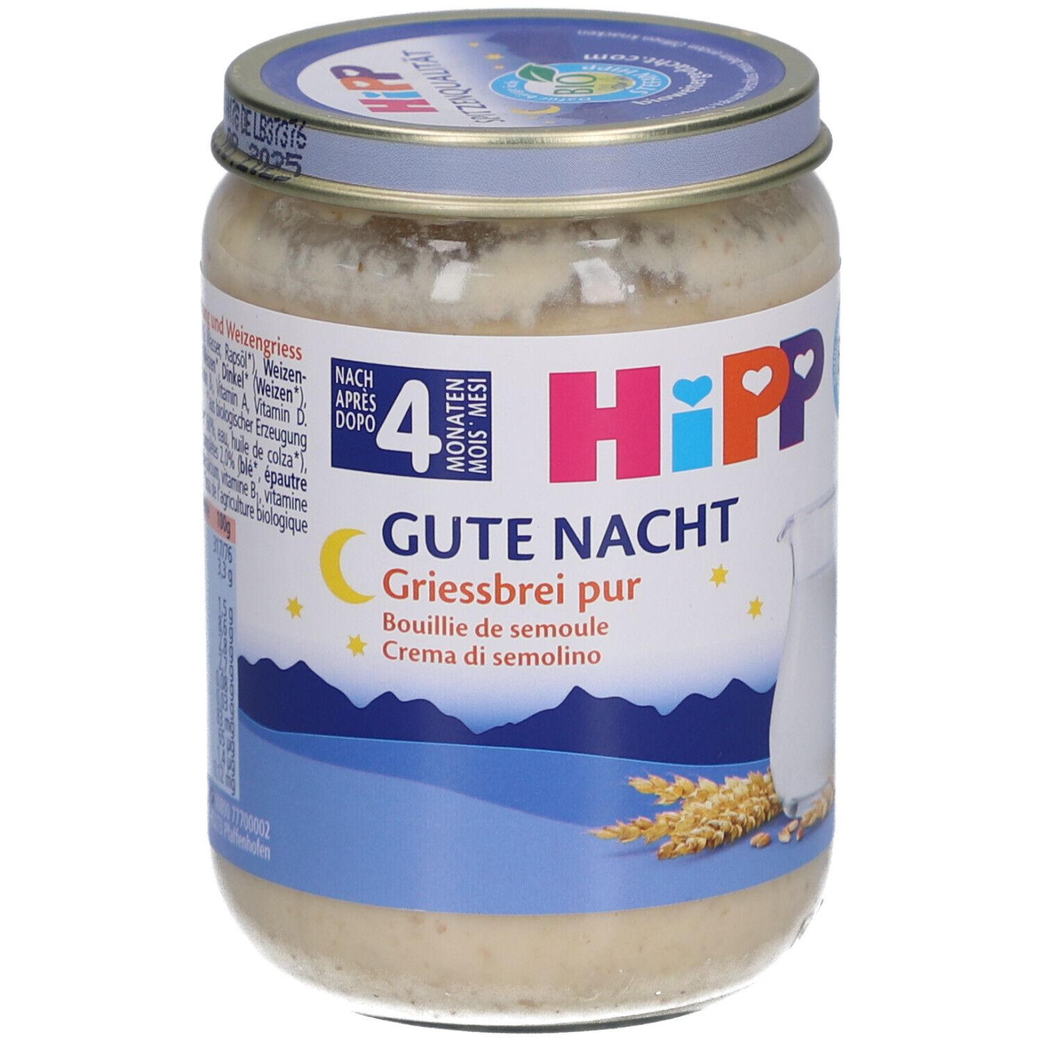 Органический детский каш HIPP Gute Nacht Porridge Pur для детей от 5 месяцев. Био-каша из манки с добавлением витаминов и кальция, подходит для вечернего кормления. Содержит молочную смесь, цельнозерновые хлопья и натуральные ингредиенты. Вес 190 г.