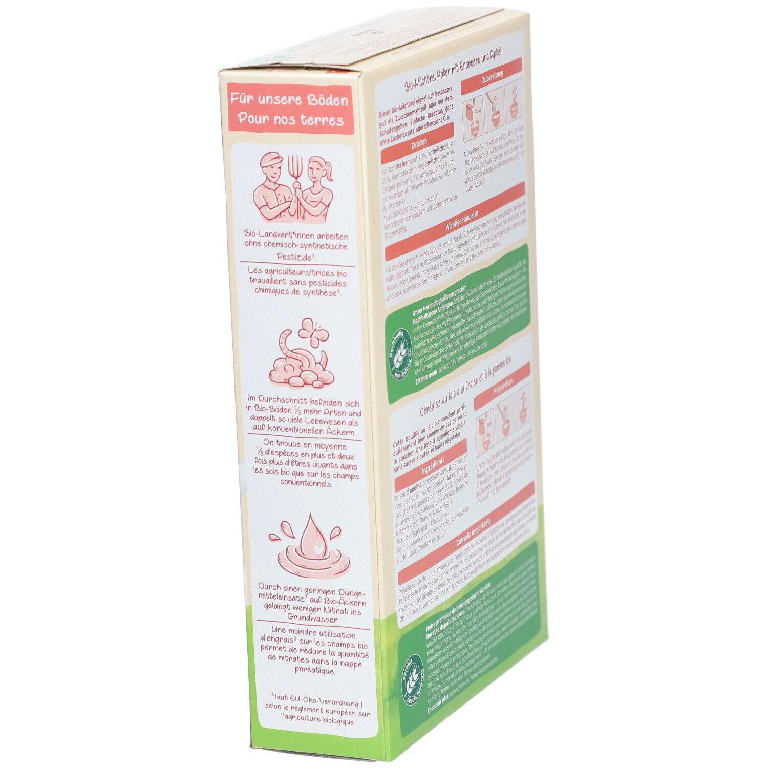 Цельнозерновая овсяная мука* 40%, цельное сухое молоко* (из частично обезжиренного молока) 40%, сушеные кусочки яблока* 7,5%, клубничный порошок* 1,8%, карбонат кальция, витамин B1 (тиамин). *из органического сельского хозяйства. Содержит молоко, глютен, сою и люпин. Может содержать следы горчицы.