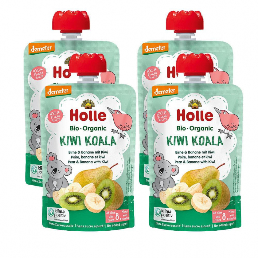Органическое фруктовое пюре Holle Bio Organic KIWI KOALA для детей после 8 месяцев. Продукт Demeter-качества без добавления сахара и соли, содержит грушу, банан и киви. Удобная упаковка 4x100 г для питания на ходу.