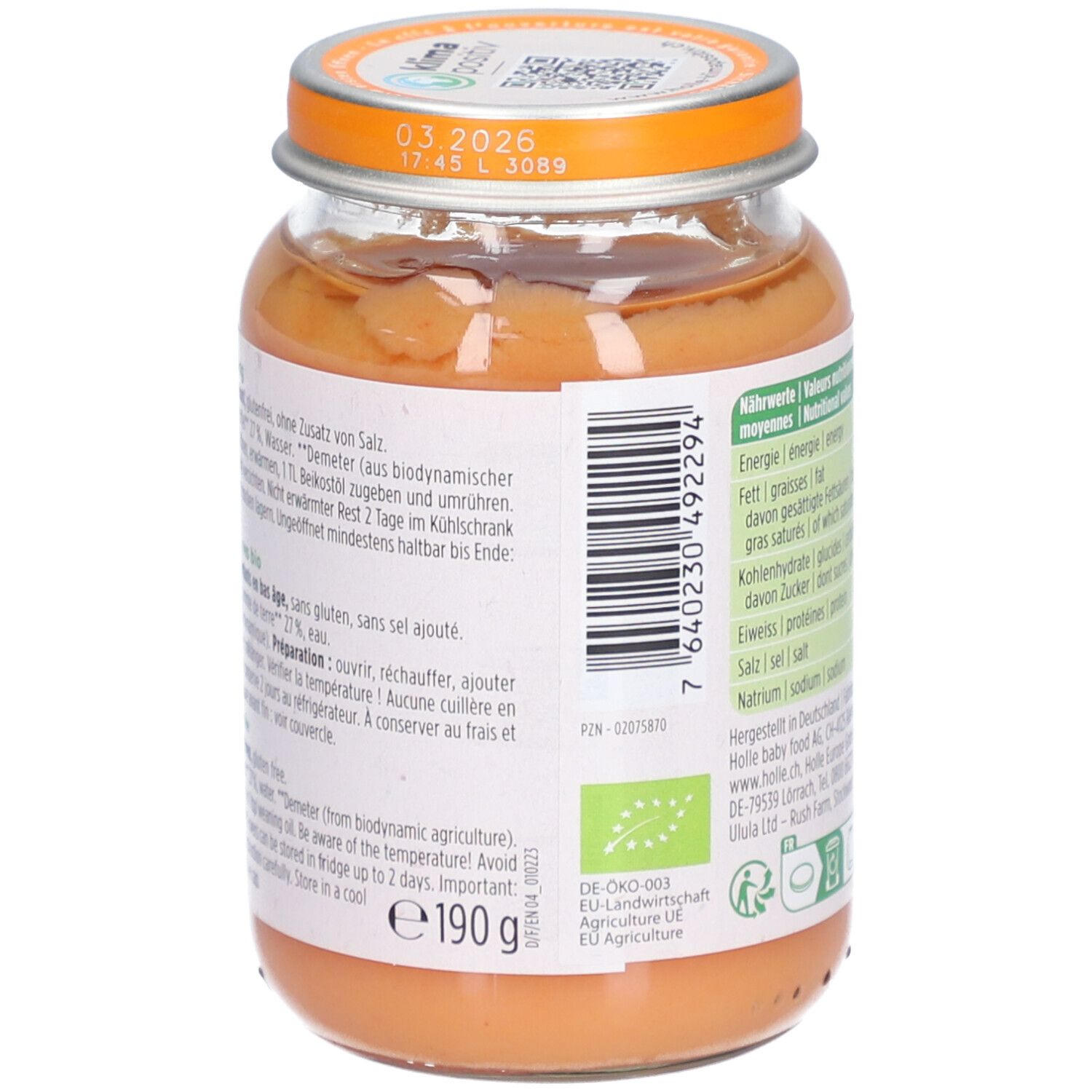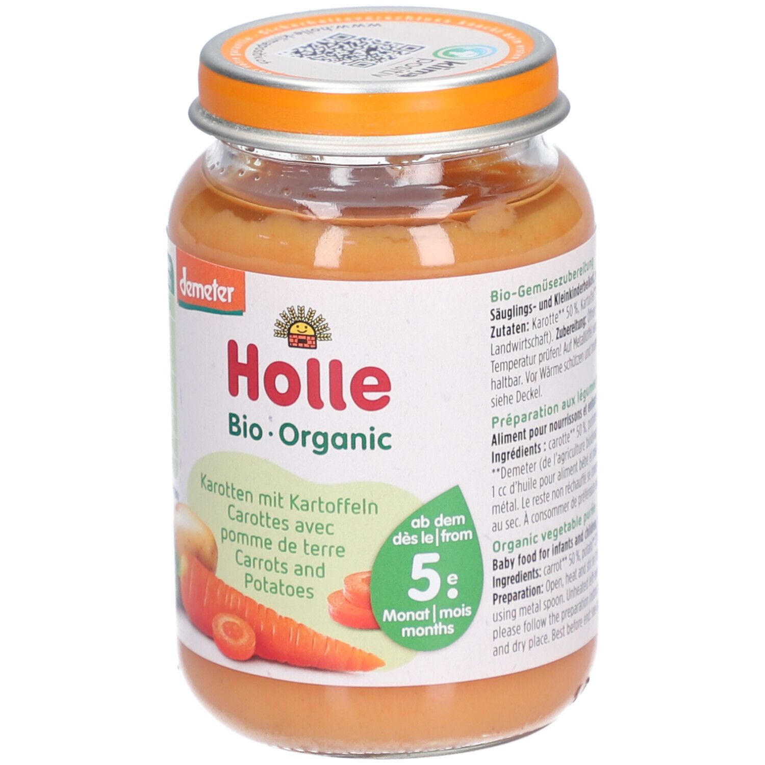 Органическое детское питание Holle с тыквой, кабачками и картофелем для детей от 6 месяцев. Без добавления сахара, соли, специй и ароматизаторов. Подходит для веганов, не содержит лактозу и глютен. Произведено в Швейцарии из биодинамических ингредиентов Demeter.