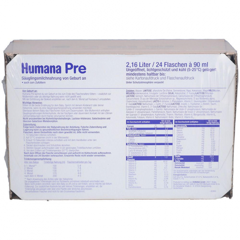 Готовая к употреблению начальная молочная смесь Humana Pre для новорожденных с рождения. Содержит только лактозу в качестве углевода, обогащена LCP (Омега-3 и 6), GOS и витаминами. Подходит как основное питание или для докорма к грудному молоку.