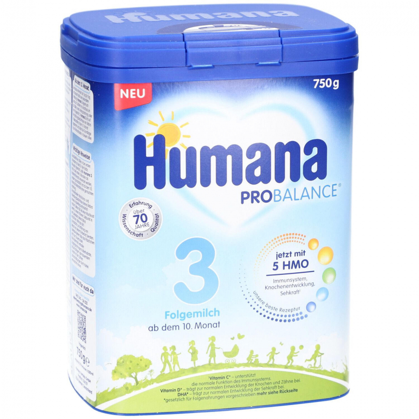 Humana PROBALANCE 3 - детская молочная смесь для детей от 10 месяцев с 5 HMO, DHA, GOS, ALA, витаминами и минералами для поддержки иммунитета, развития костей и зрения. Подходит для смешанного питания с прикормом. 750 г порошка.