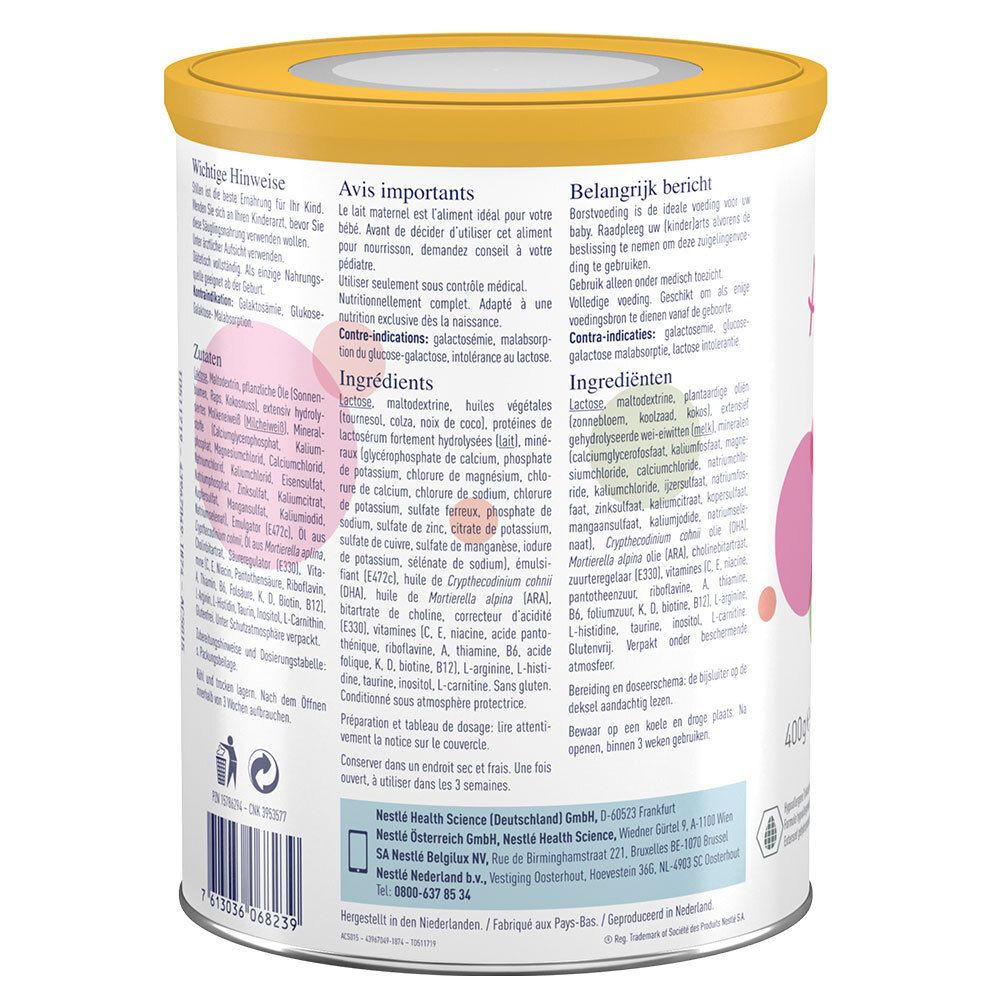 Состав: Лактоза, мальтодекстрин, растительные масла (подсолнечное, рапсовое, кокосовое), экстенсивно гидролизованный сывороточный белок (молочный белок), минералы (глицерофосфат кальция, фосфат калия, хлорид магния, хлорид кальция, хлорид натрия, хлорид калия, сульфат железа, фосфат натрия, сульфат цинка, цитрат калия, сульфат меди, сульфат марганца, йодид калия, селенат натрия), эмульгатор (E472c), масло Crypthecodinium cohnii (DHA), масло Mortierella alpina (ARA), битартрат холина, регулятор кислотности (E330), витамины (C, E, ниацин, пантотеновая кислота, рибофлавин, A, тиамин, B6, фолиевая кислота, K, D, биотин, B12), L-аргинин, L-гистидин, таурин, инозитол, L-карнитин