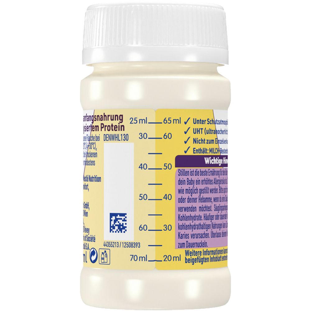 Готовая к употреблению гипоаллергенная начальная смесь для младенцев с рождения для снижения риска аллергии на коровье молоко. Содержит гидролизованный молочный белок, витамины и минералы для полноценного питания. Подходит для детей с риском аллергии, но не при уже существующей аллергии на коровье молоко.