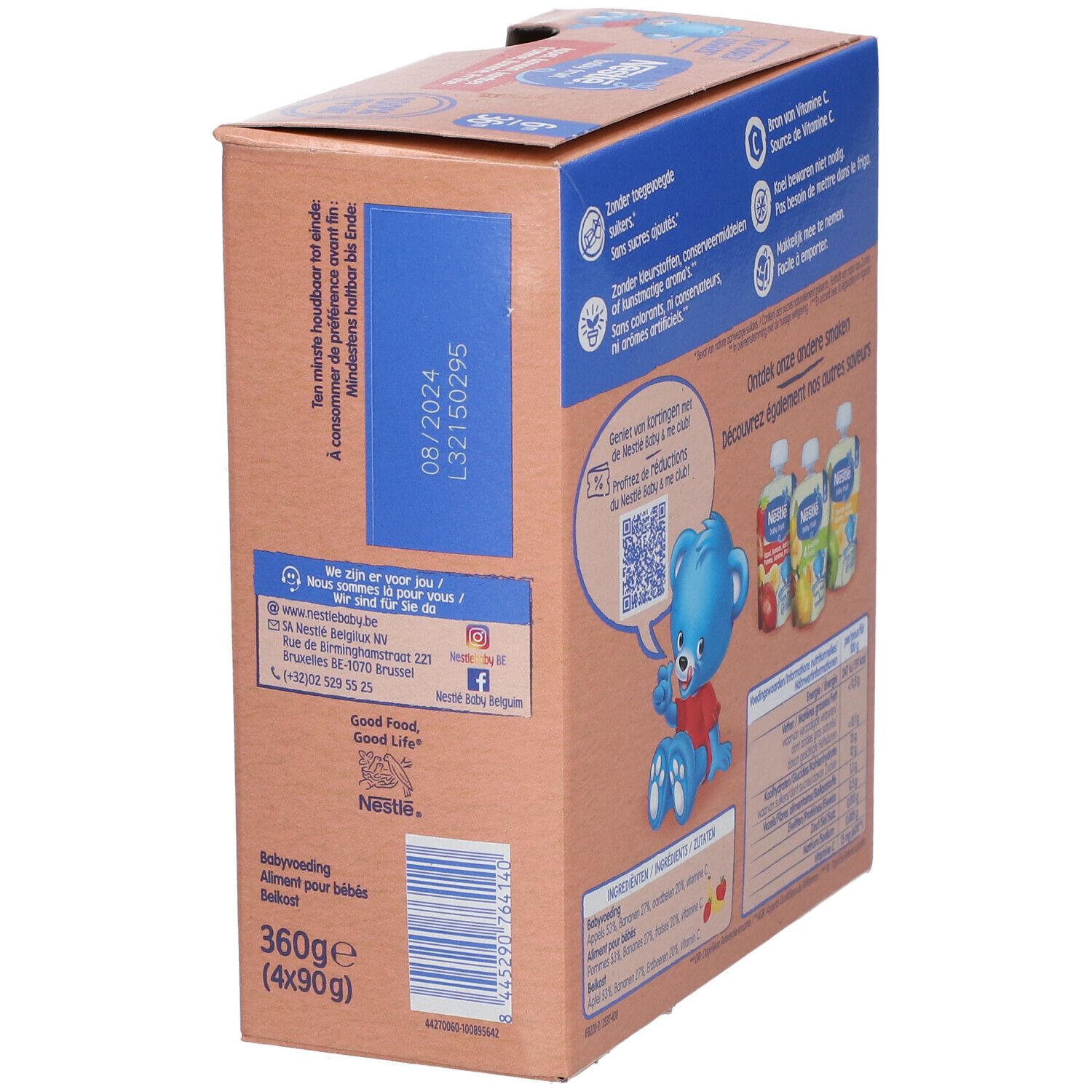 Детское фруктовое пюре NESTLE Baby Fruit с яблоком, бананом и клубникой для детей от 6 до 36 месяцев. Без добавления сахара, консервантов, красителей и искусственных ароматизаторов. Обогащено витамином C. Удобная упаковка 360 г для питания на ходу.