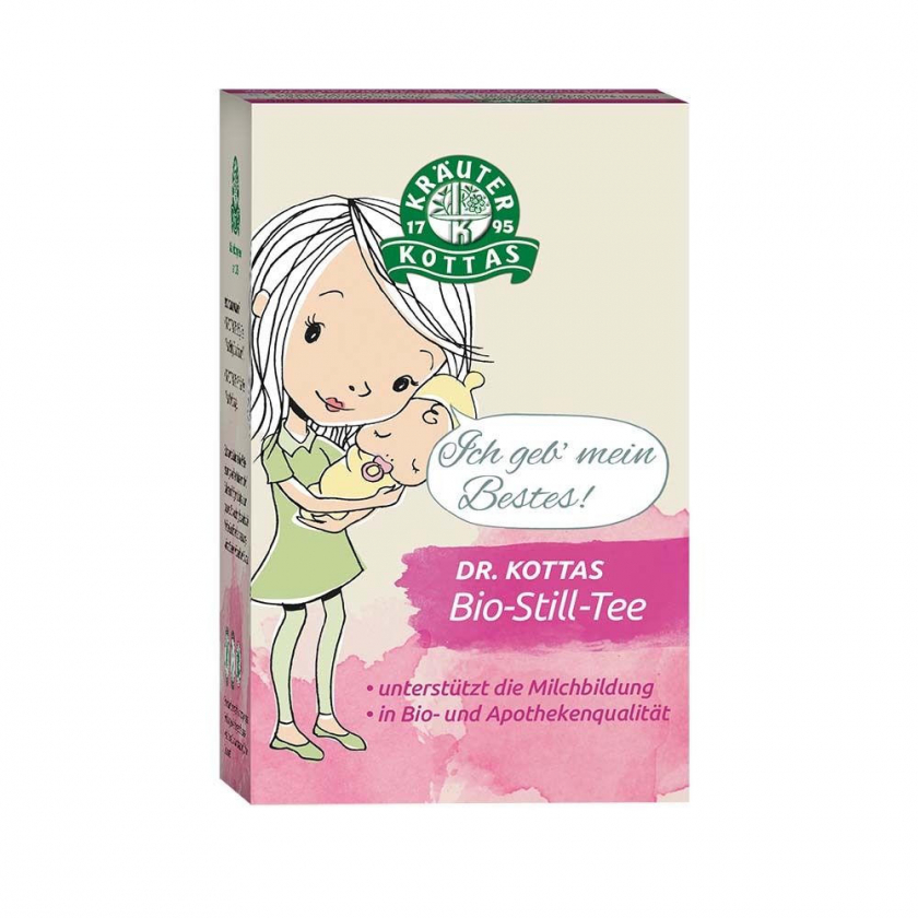 Органический травяной чай Dr. Kottas Bio-Still Tee для поддержки лактации у кормящих матерей. Содержит проверенную рецептуру из мелиссы, тмина, мальвы, аниса и бадьяна. Упаковка содержит 20 фильтр-пакетов по 26 г.