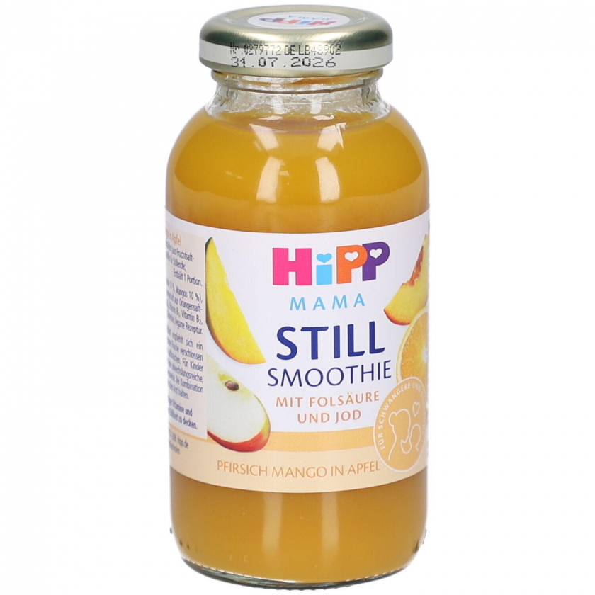 HiPP Mama Still Smoothie - мультифруктовый смузи с витаминами и минералами специально для кормящих матерей. Содержит 100% фруктовую основу с добавлением витаминов C, группы B, цинка, йода и биотина для поддержки здоровья матери в период лактации. Веганский продукт объемом 200 мл.