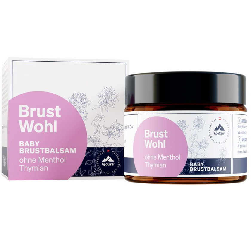 Детский грудной бальзам ApoCare BrustWohl Baby для облегчения дыхания при простуде. Содержит натуральное масло тимьяна, без ментола, минеральных масел и парабенов. Подходит для нежной кожи младенцев, помогает освободить дыхательные пути при простудных заболеваниях.