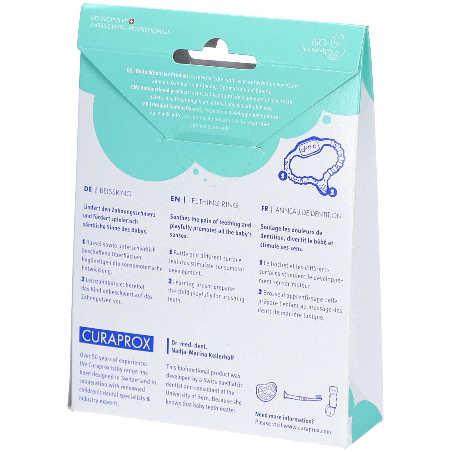 CURAPROX® Beissring - детское прорезыватель для облегчения боли при прорезывании зубов у младенцев. Способствует развитию сенсорных и моторных навыков, содержит встроенную тренировочную зубную щетку для подготовки к гигиене полости рта. Изготовлен из безопасных материалов, соответствующих европейским стандартам EN 71.